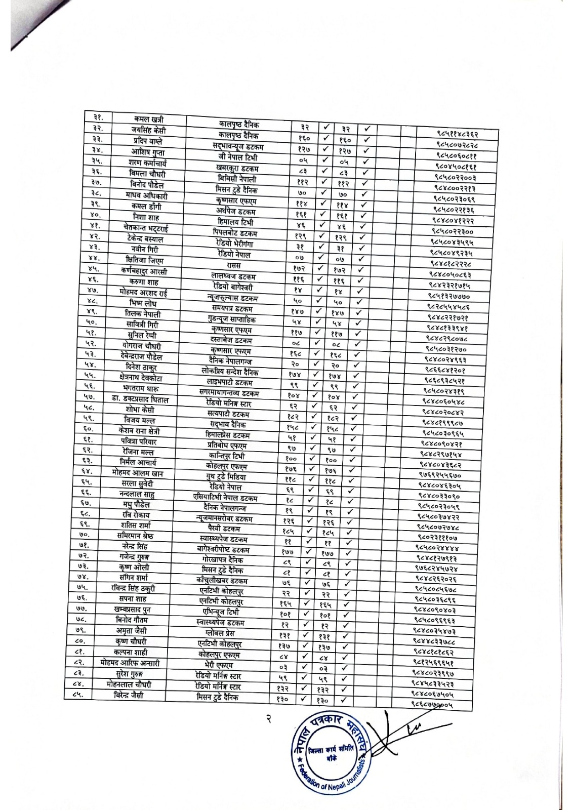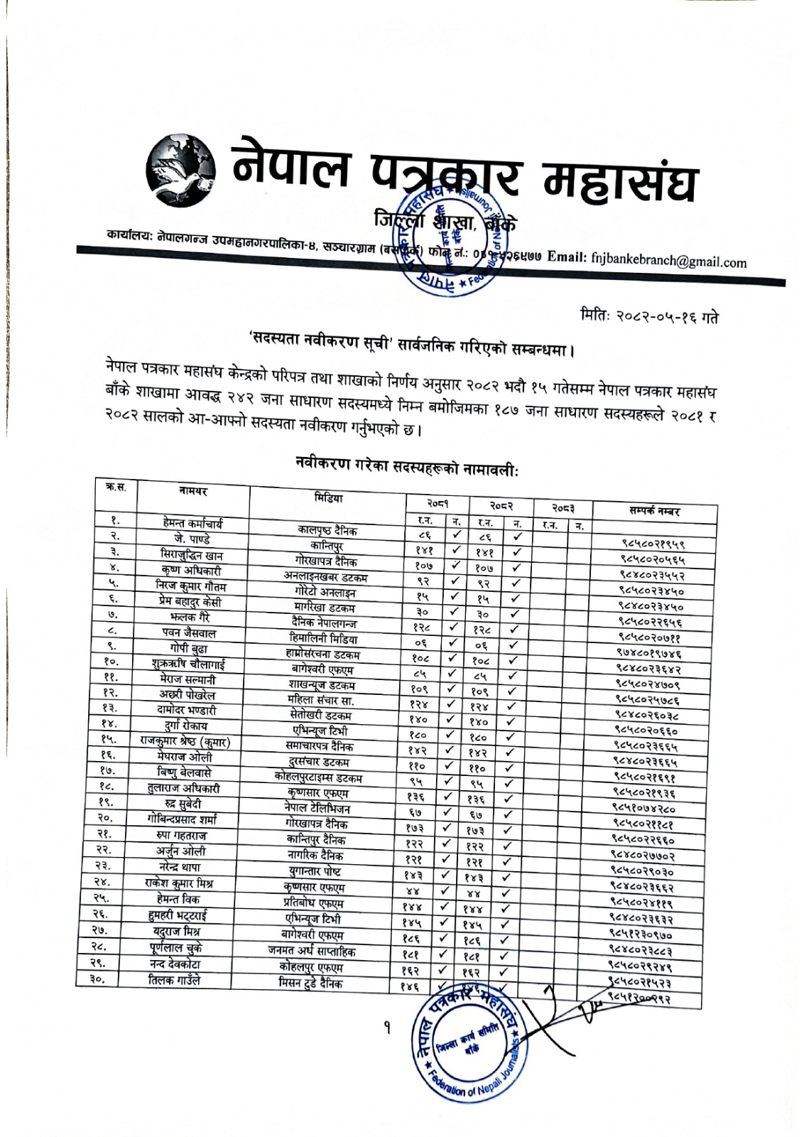 महासंघको बाँके शाखाले नविकरण गरेका १८७ सदस्यहरुको नामावली आज सामाजिक सञ्जाल मार्फत सार्वजनिक गरेको छ ।