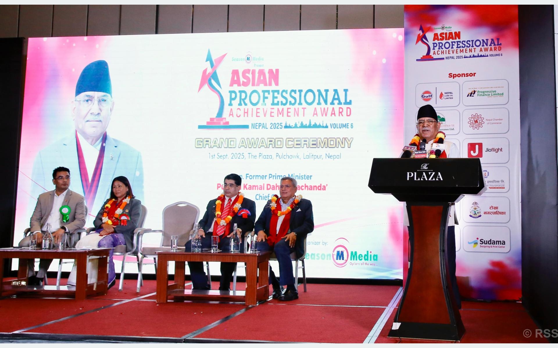 सिजन मिडियाको १७ औँ वार्षिकोत्सवको अवसरमा एसियाली मुलुकका विभिन्न पेसा तथा व्यवसायमा उत्कृष्ट काम गरिरहेका राष्ट्रिय तथा अन्तरराष्ट्रिय व्यक्तित्वहरुको सम्मानमा आज आयोजित ‘एसियाली व्यावसायिक उपलब्धि पुरस्कार २०२५’ लाई सम्बोधन गर्दै पूर्वप्रधानमन्त्री समेत रहेका प्रचण्डले यस्ता कार्यले सकारात्मक र नयाँनयाँ काम गर्नेहरुलाई ऊर्जा प्राप्त हुने विश्वास व्यक्त गरे ।