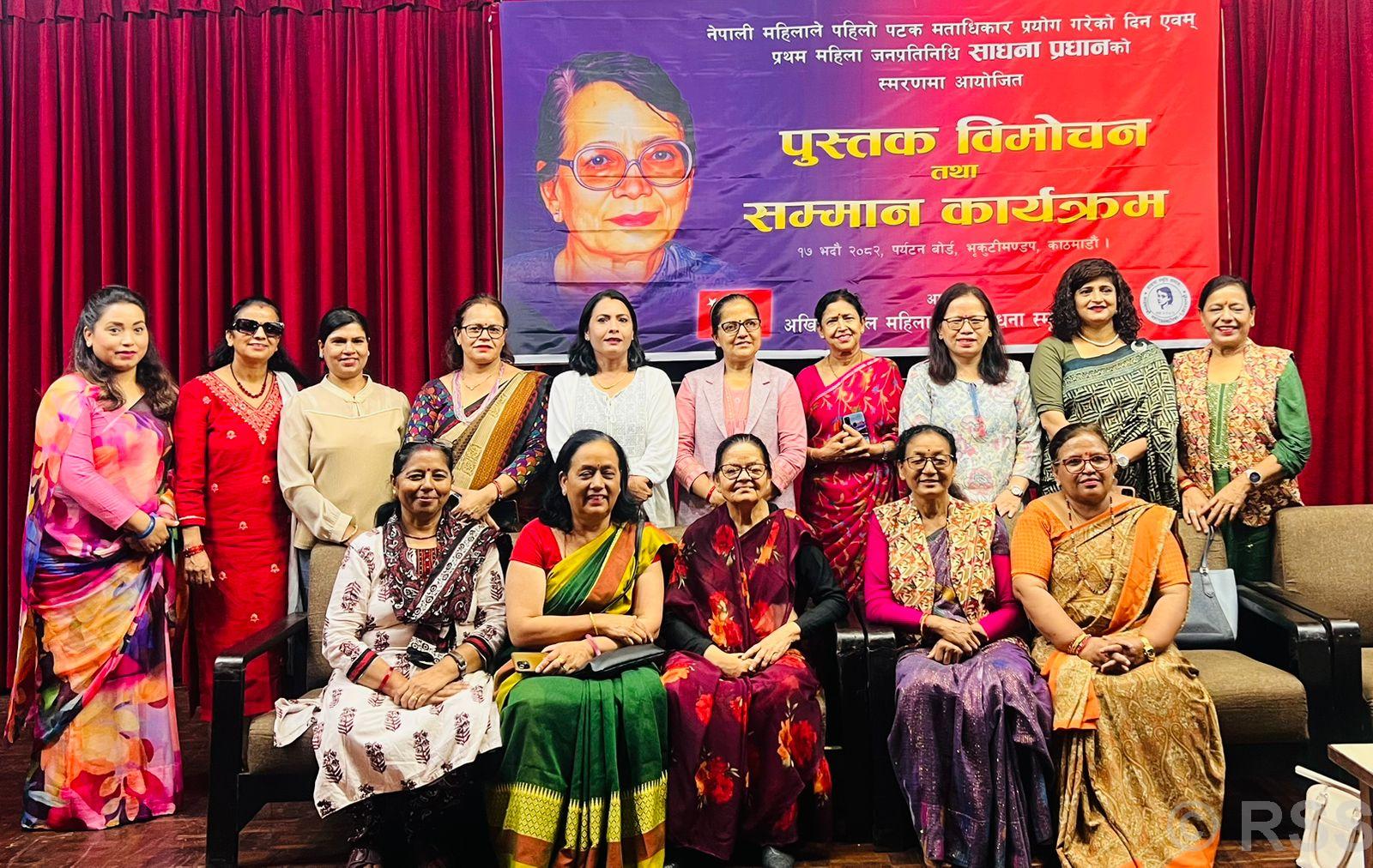 अखिल नेपाल महिला सङ्घ र साधन स्मृति समाजले आज पहिलोपटक साधना प्रधानको सम्झानामा नेपाली महिलाले पहिलोपटक मताधिकार प्रयोग गरेको दिन एवं प्रथम महिला जनप्रतिनिधि साधना प्रधानको स्मरणमा पुस्तक समेत सार्वजनिक गरेको छ ।