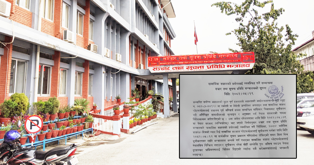 काठमाडौं । सरकारले नेपालमा दर्ता (सूचीकरण) नभएसम्म फेसबुक, युट्युबलगायत २६ वटा सामाजिक सञ्जाललाई निष्क्रिय राख्ने निर्णय गरेको छ । सञ्चार तथा सूचना प्रविधि मन्त्रालयले बिहीबार नेपाल दूरसञ्चार प्राधिकरणलाई पत्र पठाउँदै सूचीकरणमा नआएकालाई बन्द गर्न निर्देशन दिएको हो ।
