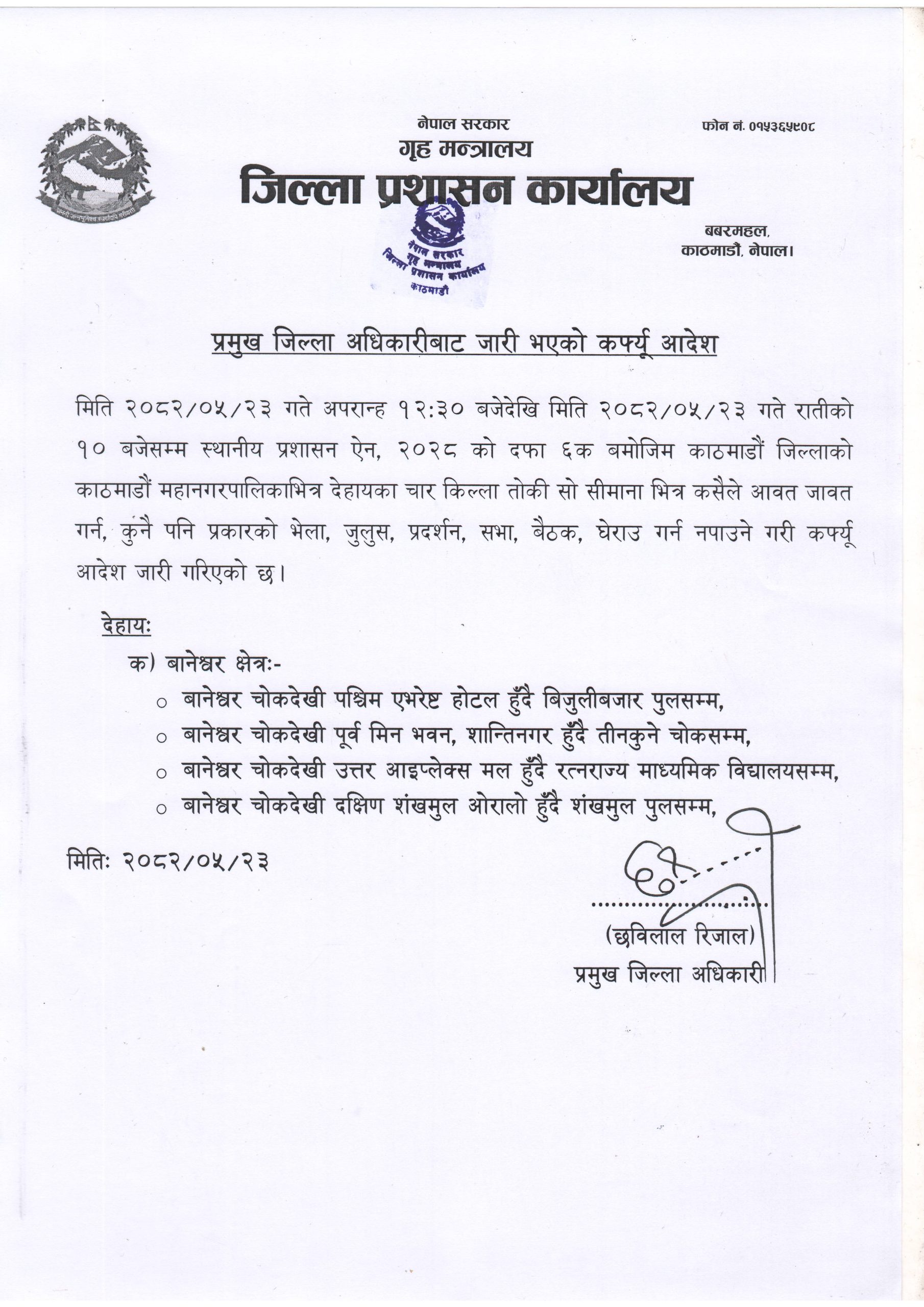 काठमाडौंका प्रमुख जिल्ला अधिकारीले कर्फ्यु आदेश जारी गरेका हुन्।