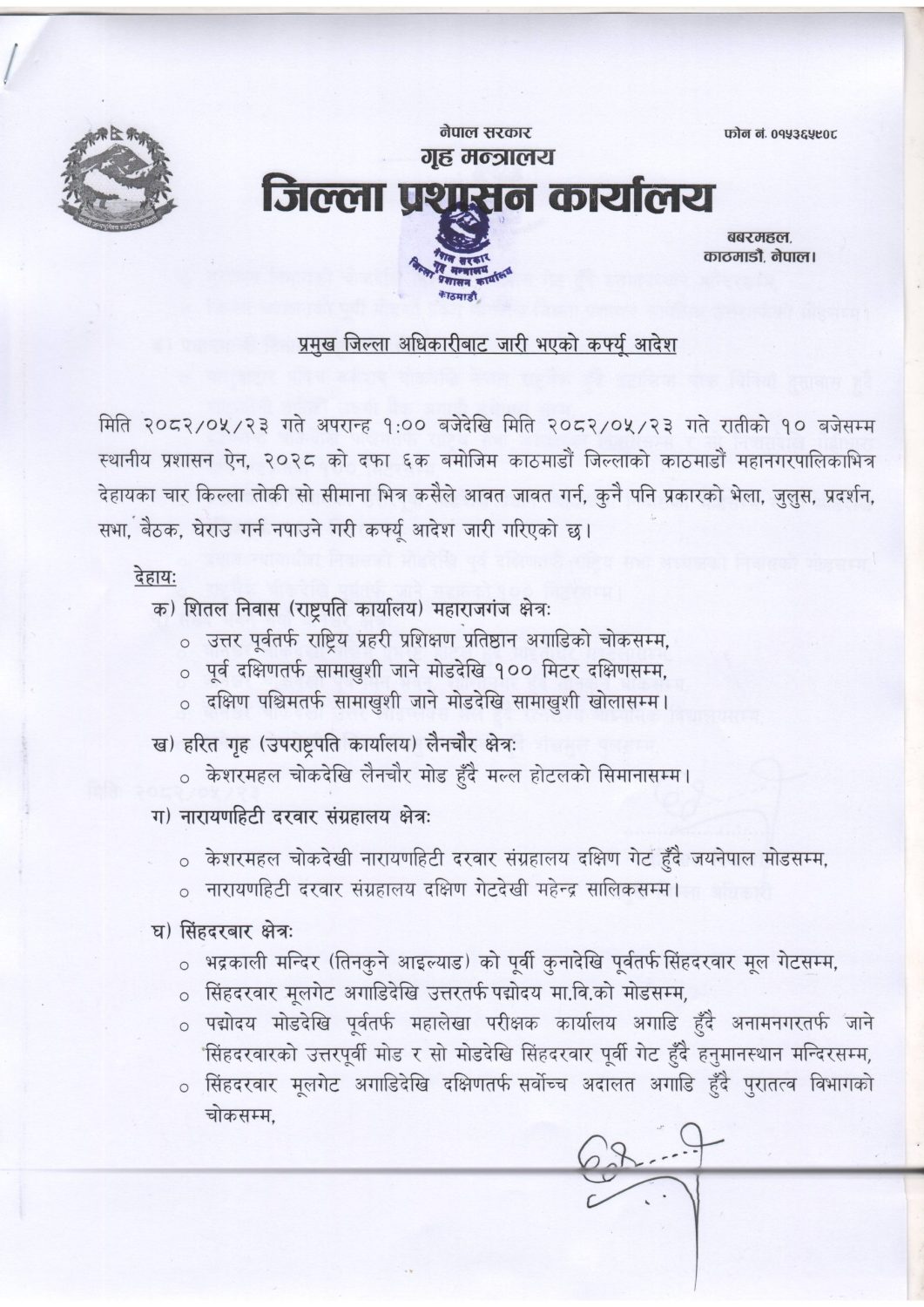 काठमाडौँ महानगरपालिकाभित्रका यी उल्लेखित क्षेत्रहरूमा शान्ति सुरक्षा कायम राख्न र कुनै पनि सम्भावित अशान्तिलाई नियन्त्रण गर्नका लागि यो आदेश जारी गरिएको प्रशासनले जनाएको छ।
