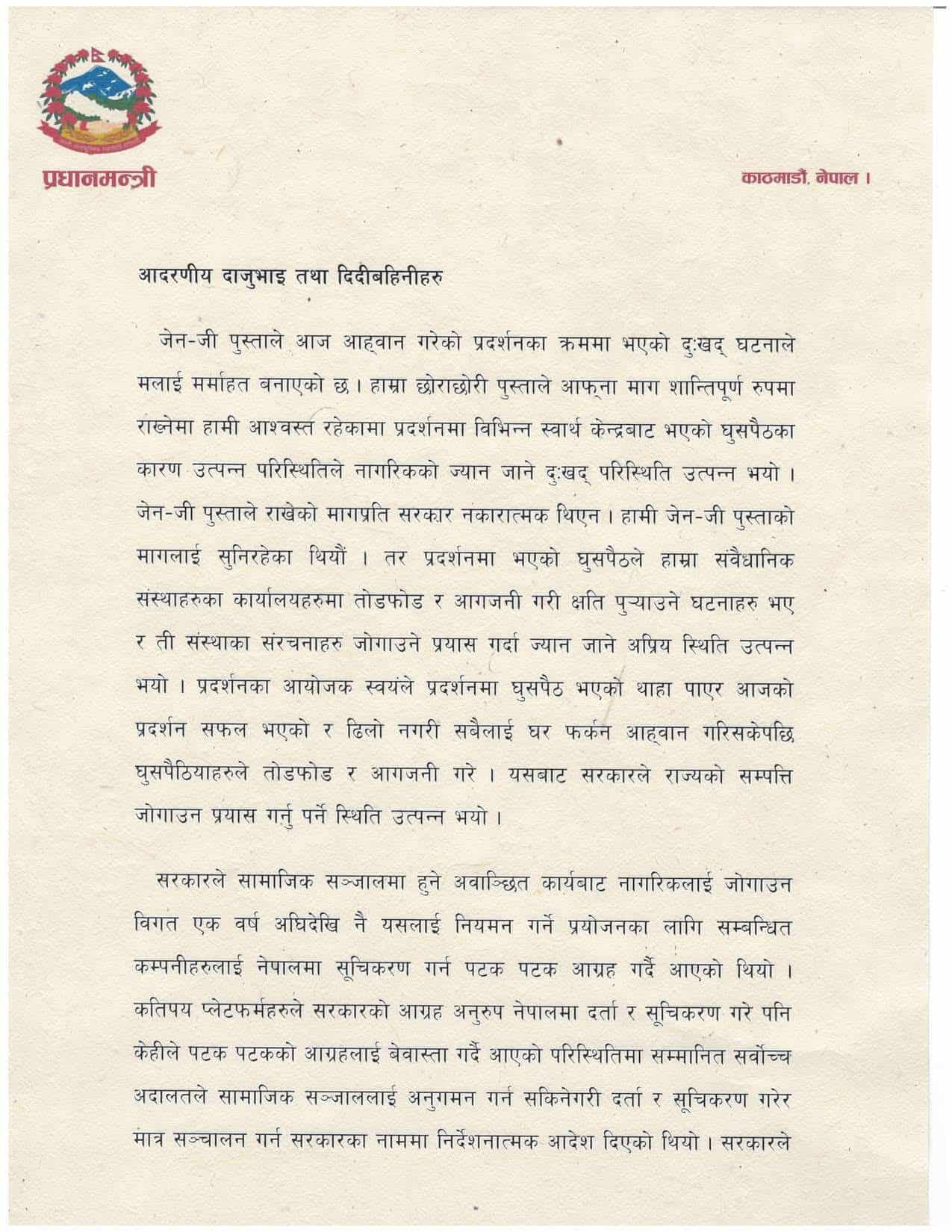 उनले वक्तब्यमा सरकार जेनजी पुस्ताको मागप्रति संवेदनशील रहेको तर प्रदर्शनमा विभिन्न स्वार्थ समूहले घुसपैठ गर्दा तोडफोड र आगजनी जस्ता घटना भएको दाबी गरेका छन् । प्रदर्शनका आयोजक स्वयंले प्रदर्शन सफल भएको घोषणा गरी घर फर्कन आग्रह गरिसकेपछि घुसपैठियाहरुले संवैधानिक संस्थाका कार्यालयमा तोडफोड र आगजनी गरेको उनले जनाएका छन् । तोडफोड र आगजनीपछि राज्यको सम्पत्ति जोगाउन सरकारले कदम चाल्नुपर्ने स्थिति आएको प्रधानमन्त्रीको भनाई छ ।