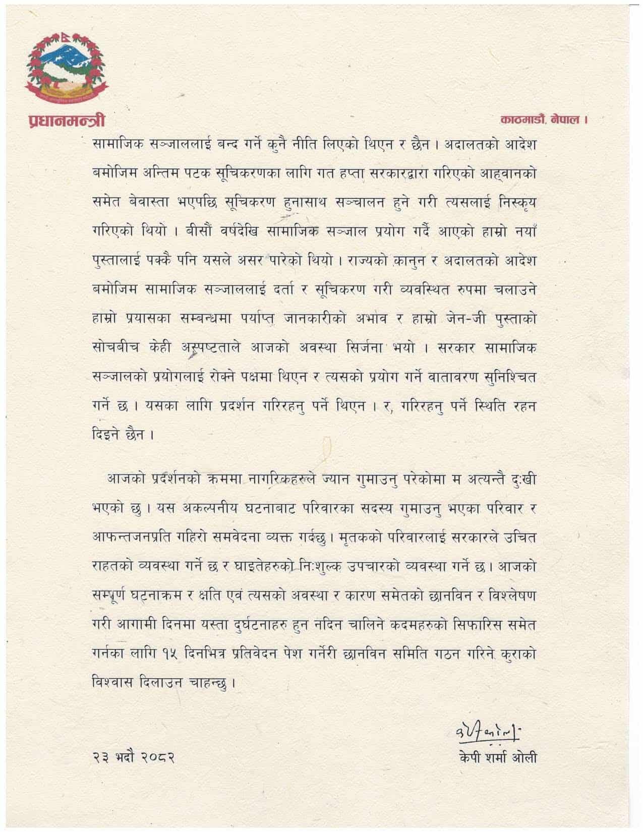 ‘सरकारले सामाजिक सञ्जाललाई रोक्ने नीति लिएको थिएन र छैन। अदालतको आदेशअनुसार सूचीकरण भए लगत्तै पुनः सञ्चालन हुने व्यवस्था गरिएको हो,’ उनले बक्तब्यमा भनेका छन् । ओलीले सामाजिक सञ्जालबारे पर्याप्त जानकारी अभाव र जेनजी पुस्ताको सोचबीचको अस्पष्टताले आजको अवस्था सिर्जना भएको उल्लेख गरेका छन् ।