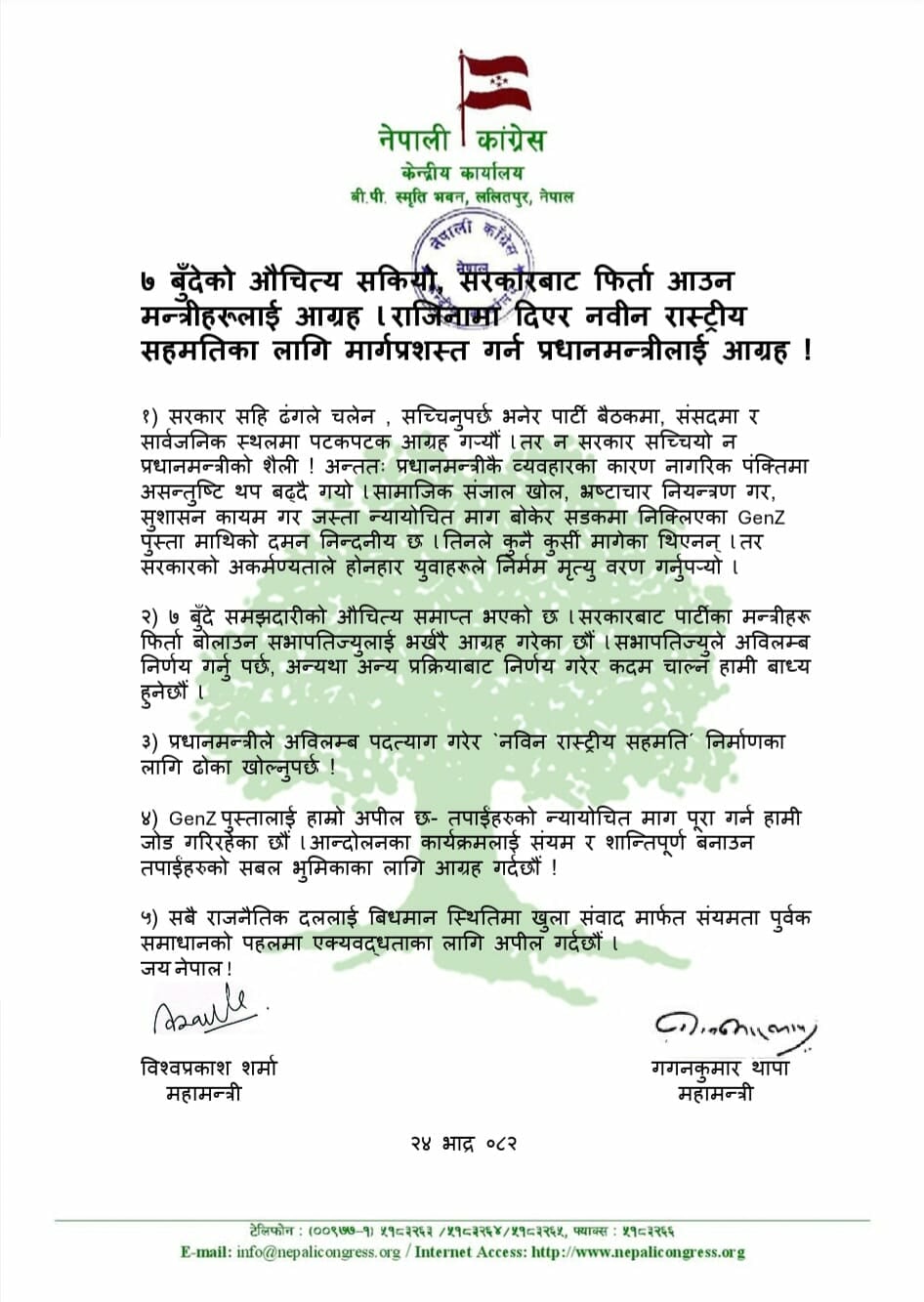उनीहरूले प्रधानमन्त्री केपी शर्मा ओलीलाई पदबाट राजीनामा दिन आग्रह गरेका छन् भने कांग्रेस सभापति शेरबहादुर देउवालाई सरकारमा रहेका सबै मन्त्रीलाई फिर्ता बोलाउन सुझाव दिएका छन्।