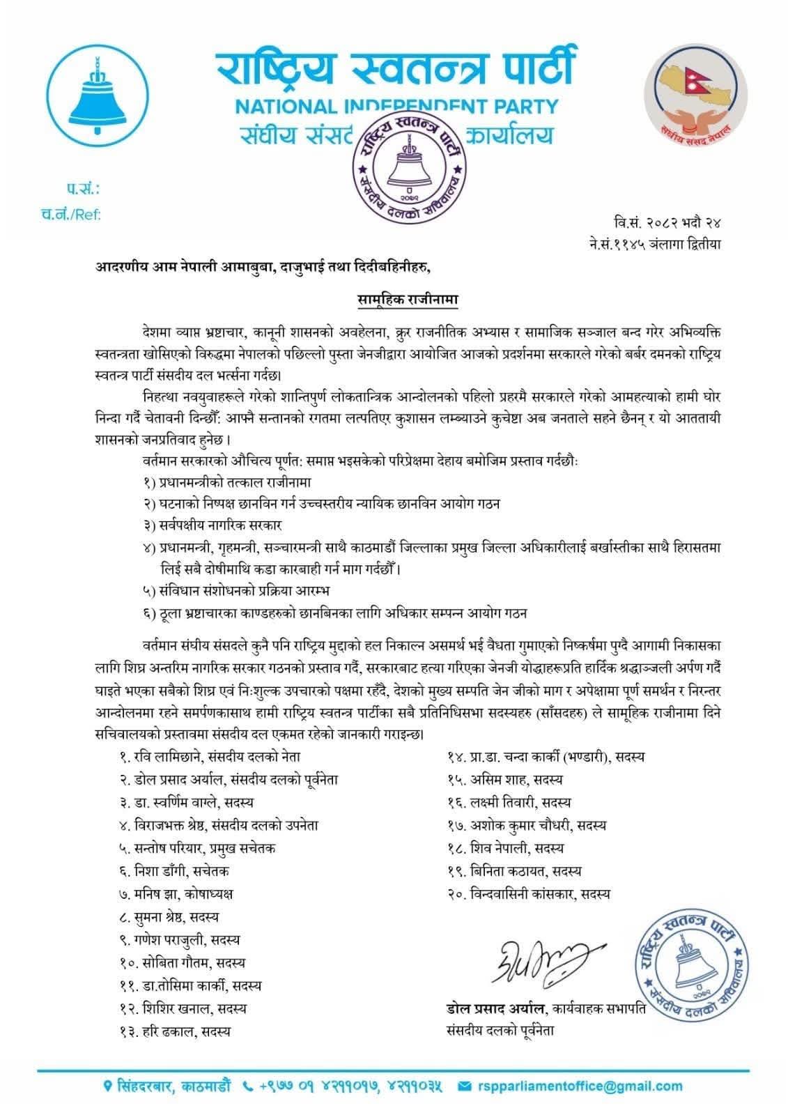 काठमाडौं । राष्ट्रिय स्वतन्त्र पार्टी (रास्वपा) का सांसदहरूले सामूहिक रूपमा संसद पदबाट राजीनामा दिएका छन् । पार्टी नेतृत्वले राजनीतिक असहमति र हालको व्यवस्थाप्रति असन्तुष्टिका कारण यस्तो कदम चालिएको जनाएको छ ।