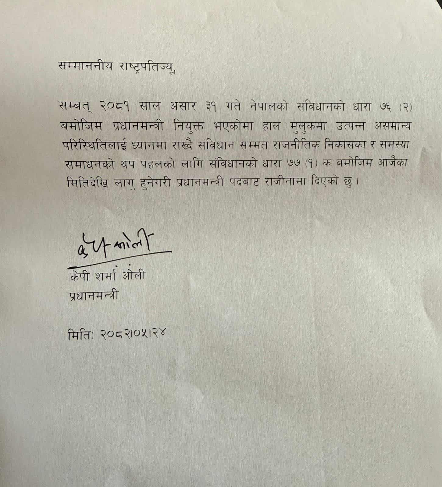 हिजोबाट शुरु भएको आन्दोलन व्यापक विरोध र हिंसात्मक घटनामा परिणत भएपछि राजनीतिक संकट गहिरिँदै गएको थियो । त्यसको जिम्मेवारीस्वरूप प्रधानमन्त्री ओलीले आज औपचारिक रूपमा राजीनामा दिएको घोषणा गरेका हुन् ।