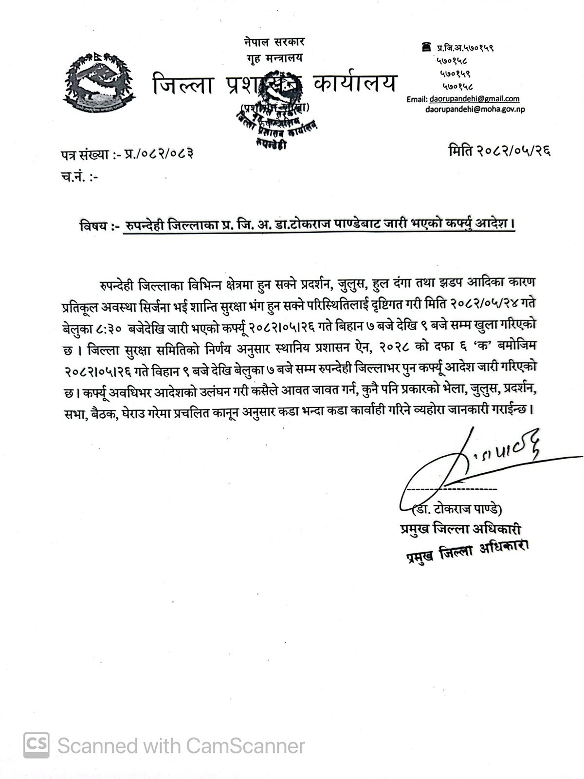 जिल्ला सुरक्षा समितिको निर्णयअनुसार स्थानीय प्रशासन ऐन, २०२८ को दफा ६ (क) बमोजिम जारी गरिएको आदेशअनुसार, कर्फ्यु अवधिभर कुनै पनि प्रकारको आवतजावत, भेला, जुलुस, प्रदर्शन, सभा वा बैठक गर्न पूर्ण प्रतिबन्ध लगाइएको छ ।