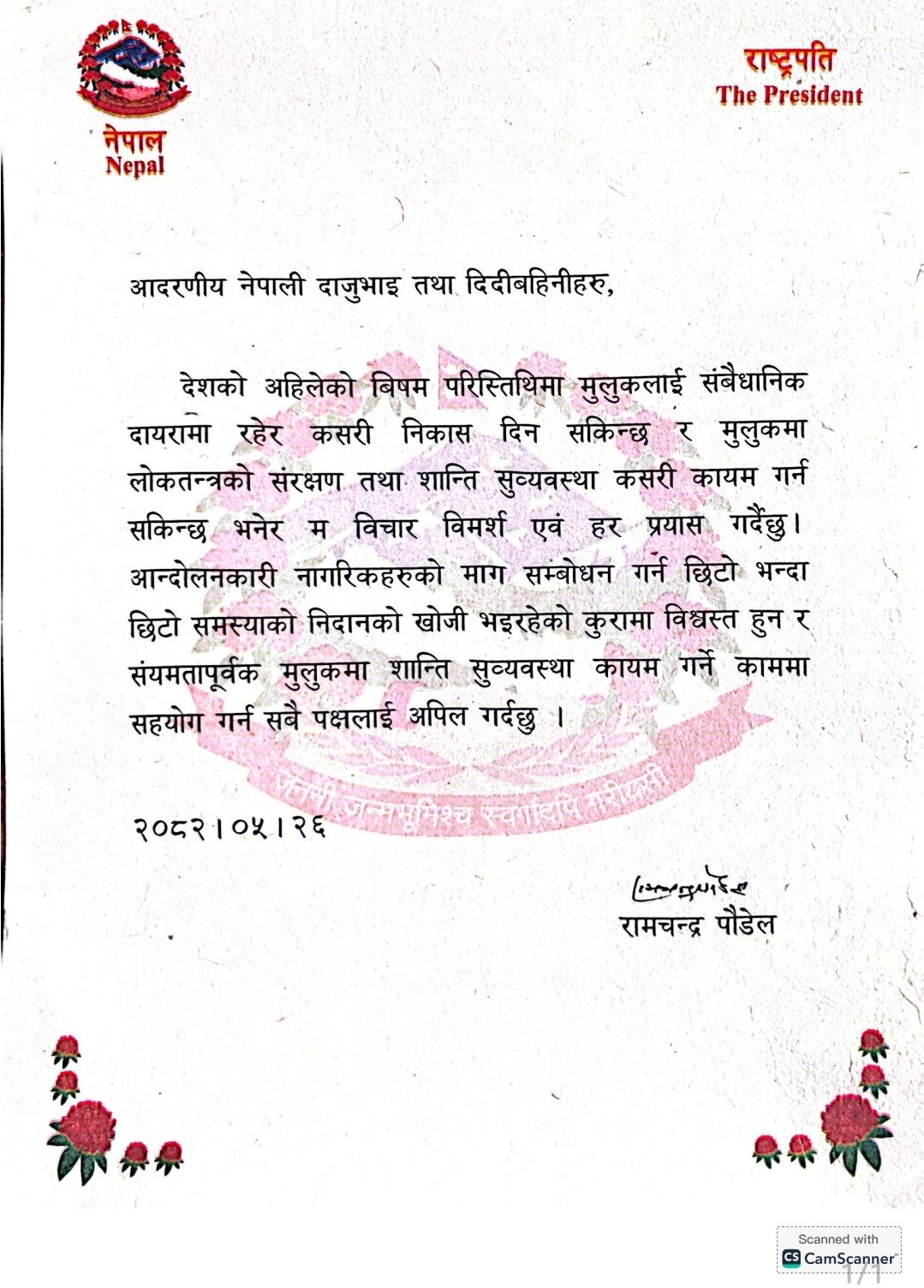बिहीबार एक वक्तव्य जारी गर्दै राष्ट्रपति पौडेलले मुलुकमा लोकतन्त्रको संरक्षण र शान्ति–सुरक्षाको स्थिति कायम गर्न आवश्यक विचार–विमर्श र प्रयास भइरहेको बताए। आन्दोलनरत नागरिकहरूको माग सम्बोधन गर्न ढिलाइ गर्नु ठिक नहुने भन्दै उनले समस्याको शीघ्र समाधान खोज्नुपर्ने आवश्यकता औंल्याए।