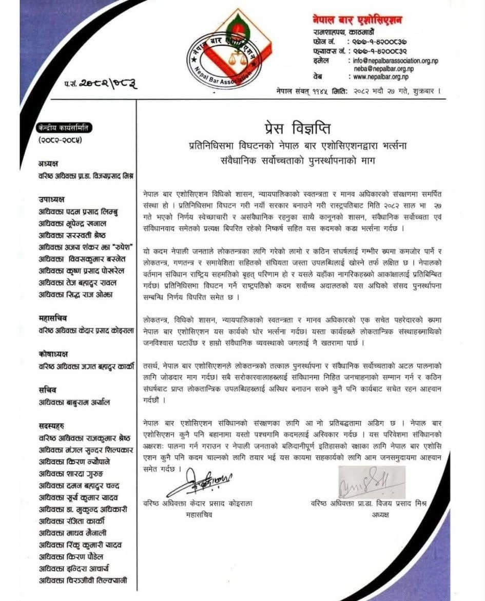 गएराति नवनियुक्त अन्तरिम प्रधानमन्त्री सुशीला कार्कीको सिफारिसमा राष्ट्रपति पौडेलले संसद विघटन गरेपछि बारले विज्ञप्ति जारी गर्दै उक्त निर्णय असंवैधानिक भएको जनाएको हो ।
