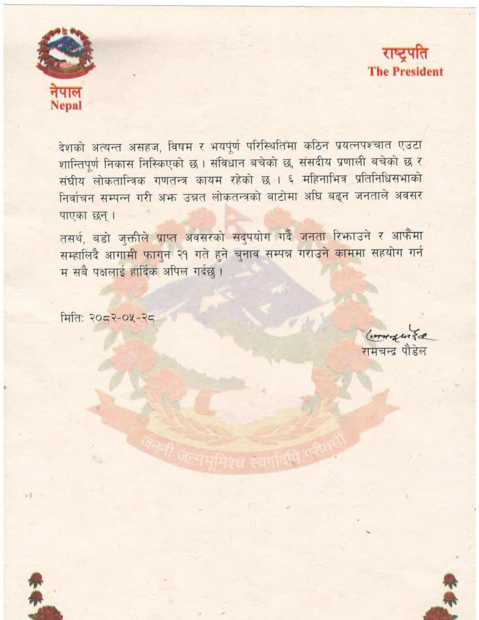 राष्ट्रपति पौडेलले भने परिस्थितिअनुरुप शान्तिपूर्ण निकास निस्किएको अवस्थामा प्रतिनिधि सभा विघटनको निर्णय स्वीकारेर निर्वाचन गराउन सबैलाई सहयोग गर्न अपील गरेका हुन् ।