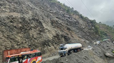 चितवन । नारायणगढ–मुग्लिन सडकखण्डको तुइन खोलामा ठूलो पहिरो खसेको छ । शुक्रबार साँझ ६ः०० बजेदेखि निरन्तर खसेको पहिरोले १०० मिटर सडक ढाकेको छ ।