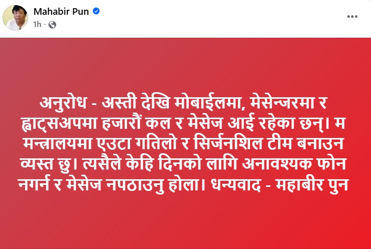 उनले फेसबुकमा लेखेका छन्, “अस्तीदेखि मोबाइलमा, मेसेन्जरमा र ह्वाट्सएपमा हजारौँ कल र मेसेज आइरहेका छन् । म मन्त्रालयमा एउटा गतिलो र सिर्जनशील टिम बनाउन व्यस्त छु । त्यसैले केही दिनको लागि अनावश्यक फोन नगर्न र मेसेज नपठाउनु होला । धन्यवाद ।”