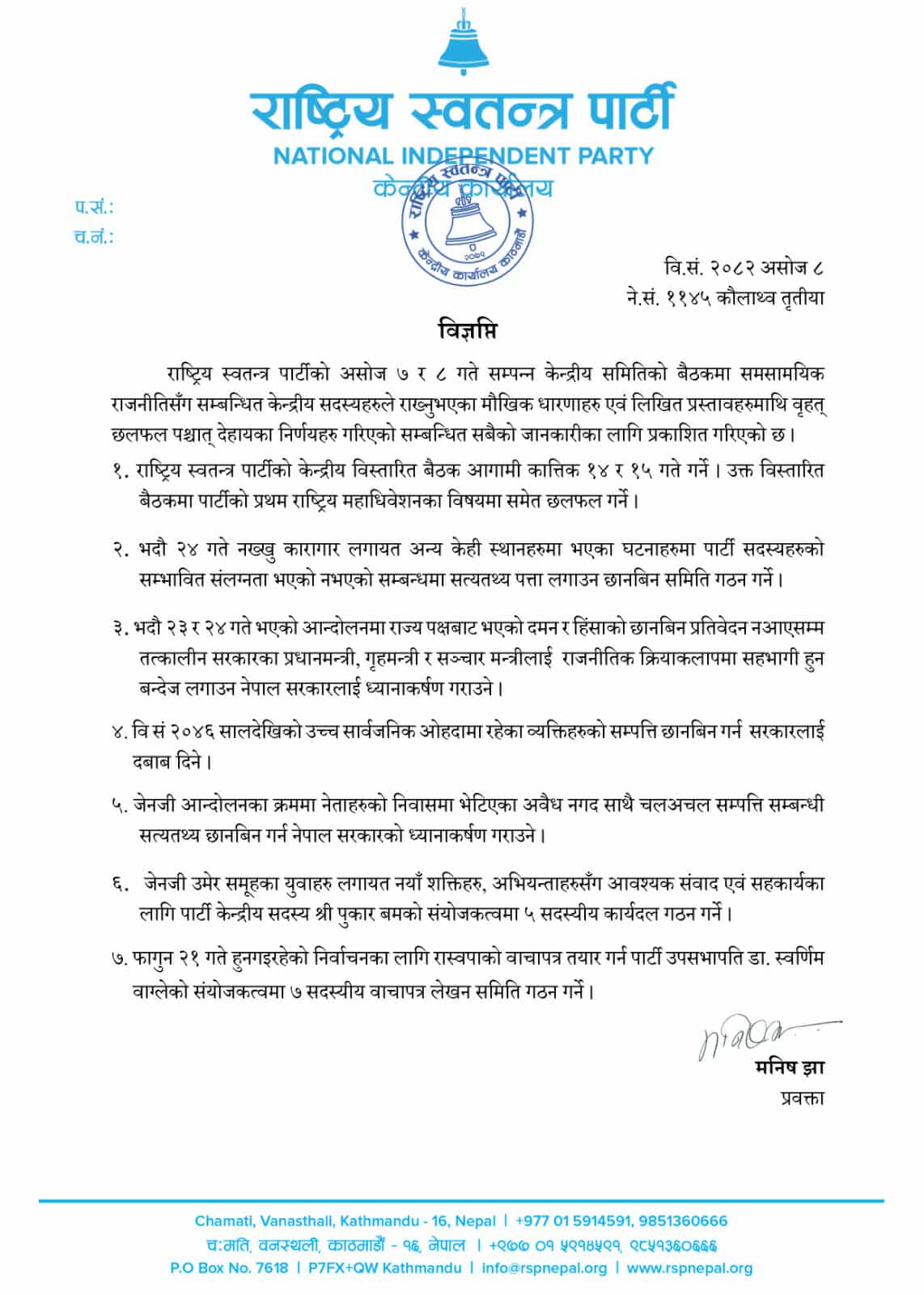 ‘भदौ २३ र २४ गते भएको आन्दोलनमा राज्य पक्षबाट भएको दमन र हिंसाको छानबिन प्रतिवेदन नआएसम्म तत्कालीन सरकारका प्रधानमन्त्री, गृहमन्त्री र सञ्चार मन्त्रीलाई राजनीतिक क्रियाकलापमा सहभागी हुन बन्देज लगाउन नेपाल सरकारलाई ध्यानाकर्षण गराउने।’ बैठकपछि रास्वपाका प्रवक्ता मनीष झाले जारी गरेको विज्ञप्तिमा भनिएको छ ।