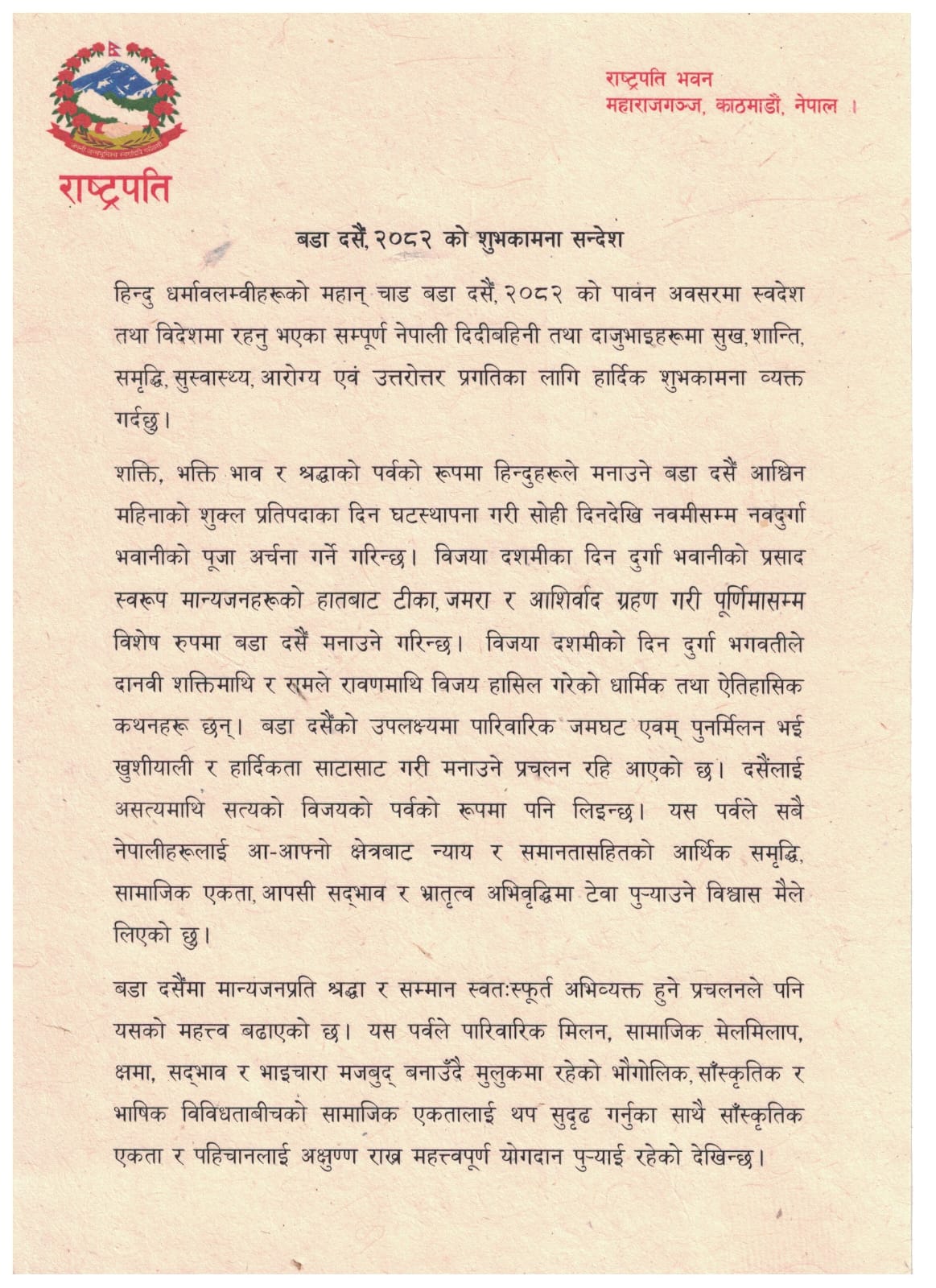 दसैँ पर्वको संरक्षण एवम् सम्वर्द्धनबाट राष्ट्र र राष्ट्रियताप्रति अटल सम्मान र गहिरो प्रेमको भावना जागृत गर्न सहयोग पुग्ने विश्वास उनको छ । यही सन्देशका साथ राष्ट्रपति पौडेलले बडादसैँ २०८२ ले सबैमा नयाँ उत्साह, उमंग र सकारात्मक ऊर्जा विकास गर्न सकोस् भन्ने कामना गरेका छन् ।