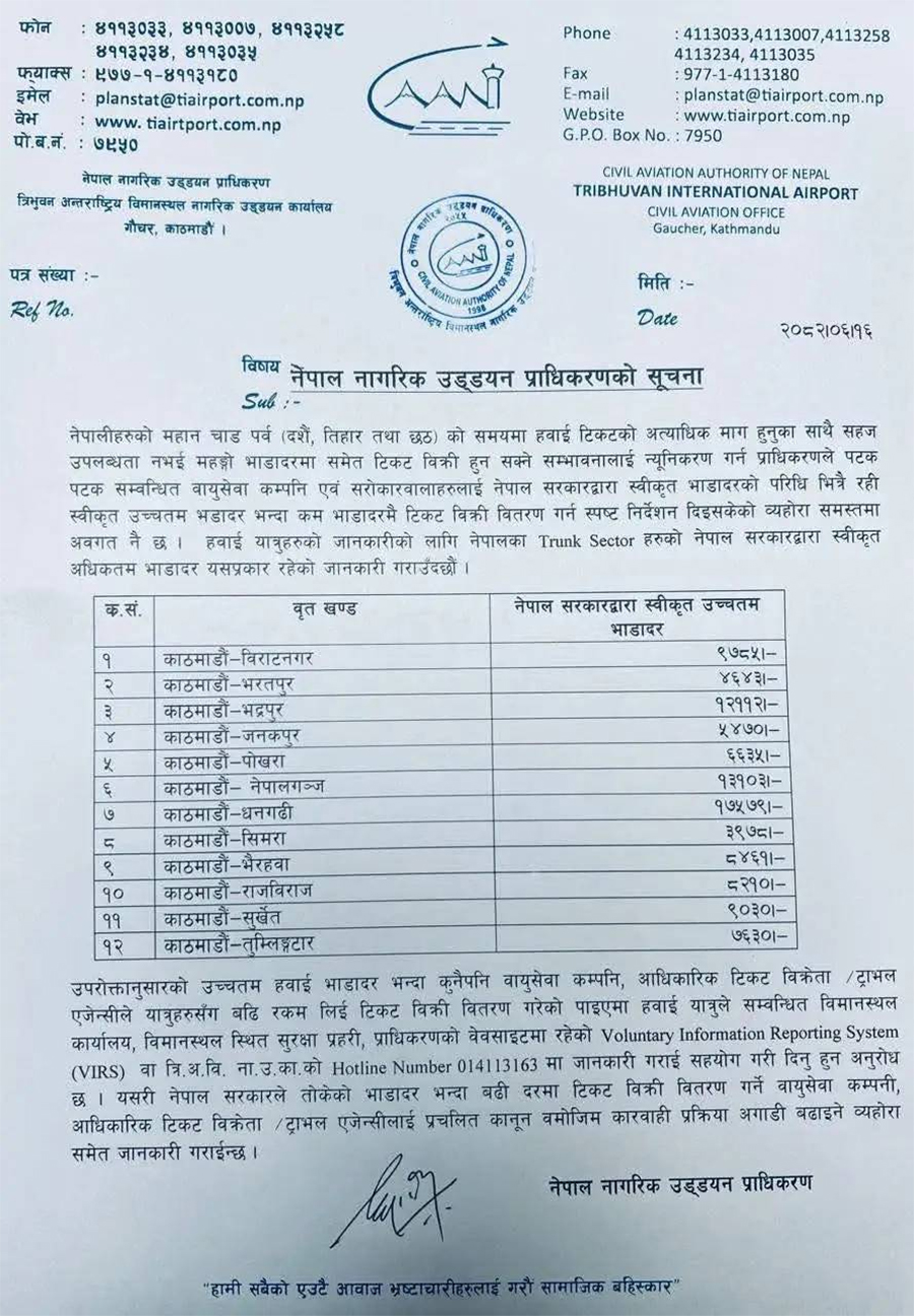 दशैं, तिहार तथा छठको समयमा हवाई टिकटको अत्यधिक माग हुने भएको र अत्याधिक मागको फाईदा उठाउँदै महँगो भाडादरमा समेत टिकट बिक्री हुन सक्ने सम्भावनालाई न्यूनीकरण गर्न भन्दै प्राधिकरणले आन्तरिक गन्तव्यमा अधिकतम भाडादर सार्वजनिक गरेको हो ।