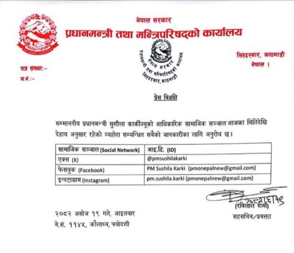 प्रधानमन्त्री कार्यालयले आज एक प्रेस बिज्ञप्ति जारी गर्दै प्रधानमन्त्री सुशीला कार्कीको आधिकारिक सामाजिक सञ्जाल सार्वजनिक गरेको हो ।
