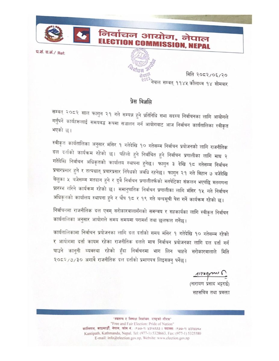 फागुन २१ को निर्वाचन प्रक्रिया प्रारम्भ, आयोगबाट निर्वाचन कार्यतालिका स्वीकृत