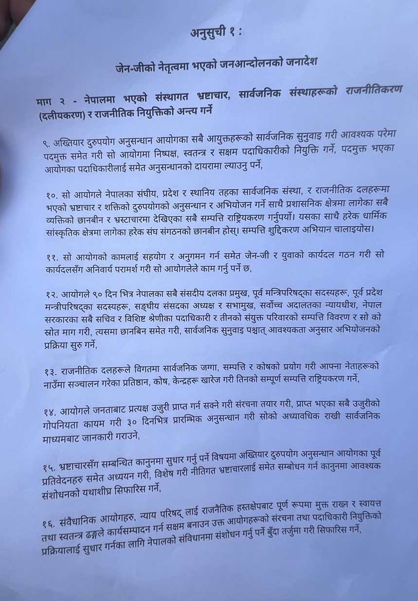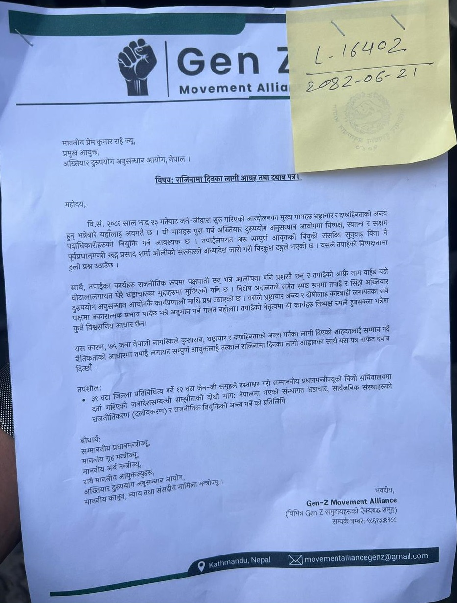 दर्ता गराइएको पत्रमा भनिएको छ, “कुशासन, भ्रष्टाचार र दण्डहीनताको अन्त्यका लागि ७५ जना नेपाली नागरिकले दिएको बलिदानलाई सम्मान गर्दै हामी तपाईंलगायत सम्पूर्ण आयुक्तहरूलाई तत्काल राजीनामा दिन आह्वान गर्दै यो दबाबपत्र पेश गर्दछौं।”