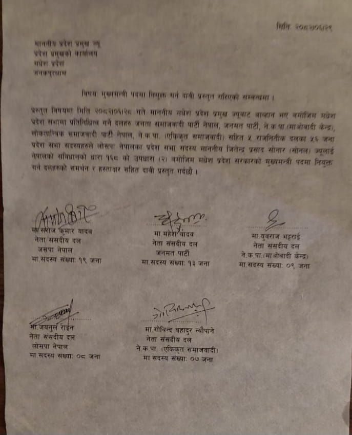 सहमति पत्रमा जसपा संसदीय दलका नेता सरोजकुमार यादव, जनमत पार्टीका नेता महेश यादव, माओवादी केन्द्रका युवराज भट्टराई, लोसपाका जयनुल राय र एकीकृत समाजवादीका नेता गोविन्दप्रसाद न्यौपानेले हस्ताक्षर गरेका छन्।