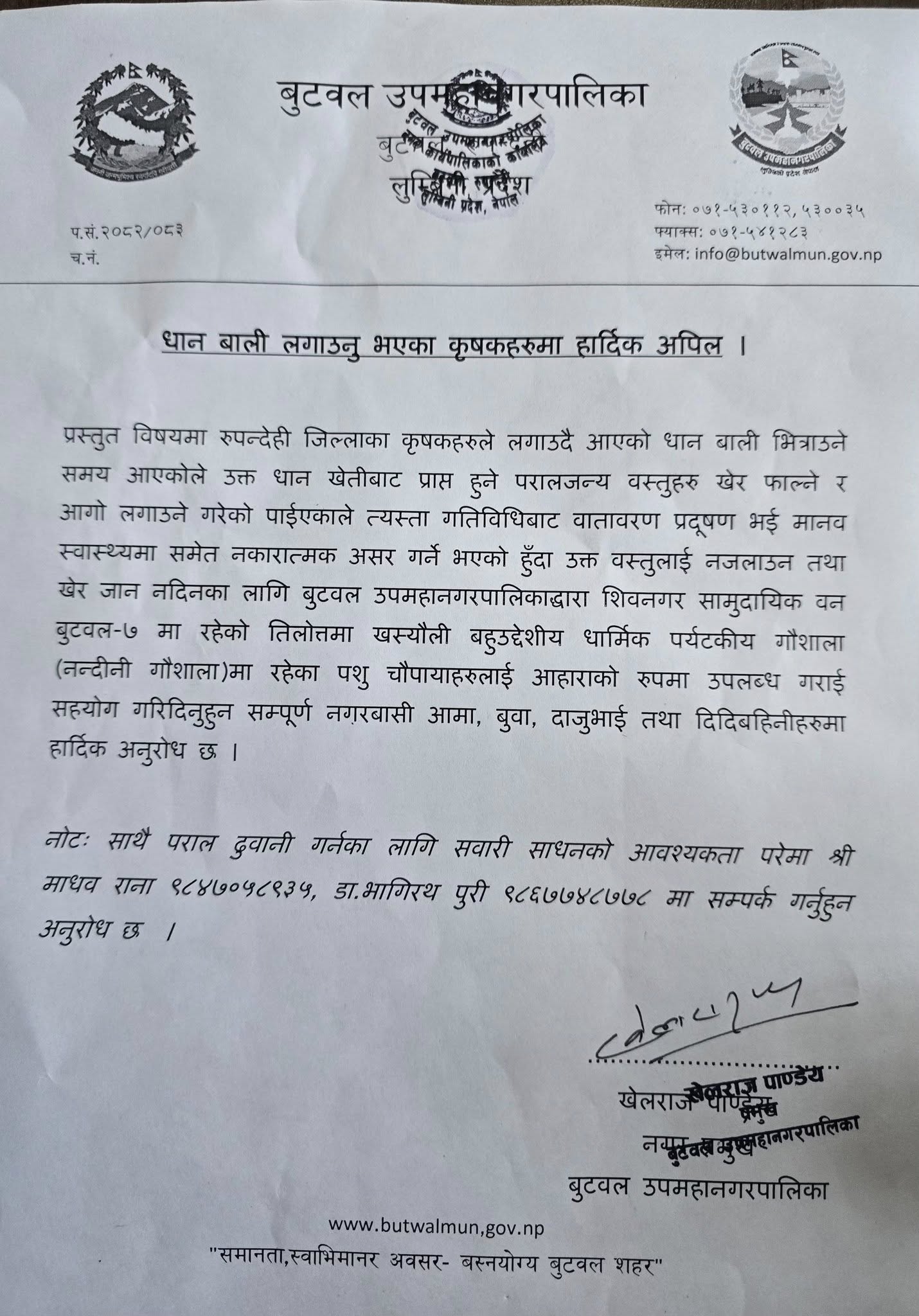 बुटवल । बुटवल उपमहानगरपालिकाले कृषकहरुलाई अपिल गर्दै धान बाली स्याहार्दा उत्पन्न हुने पराल खेर नगरी गौशालालाई उपलब्ध गराउन आग्रह गरेको छ । पछिल्लो समय कृषकहरुले पराल खेतमै जलाउने गरेको पाइएपछि यसले वातावरणमा प्रदूषण बढाउने र मानव स्वास्थ्यमा नकारात्मक असर पुर्याउने भएकाले उपमहानगरपालिकाले यस्तो पहल अघि सारेको हो ।