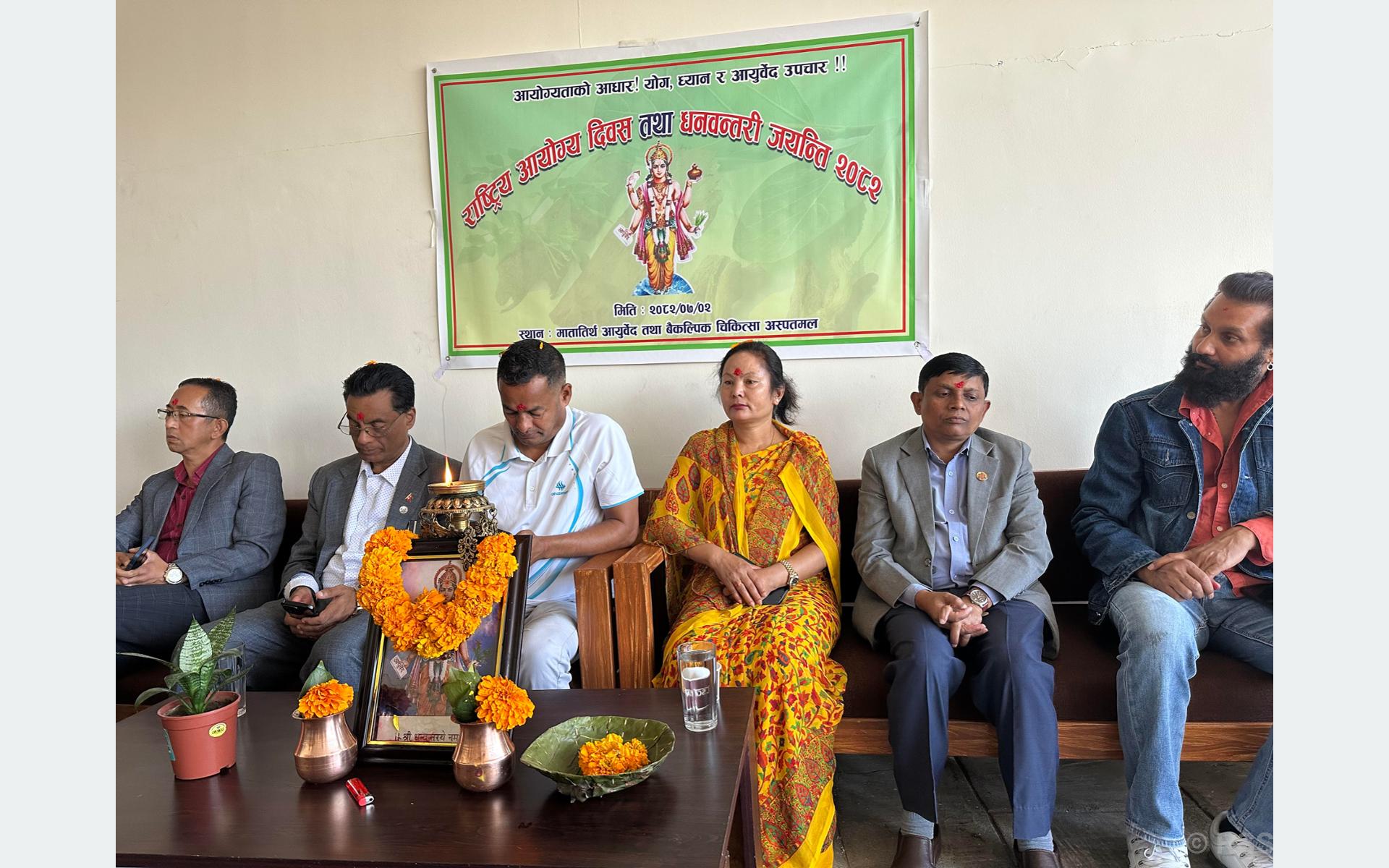 धनवन्तरी जयन्तीका अवसरमा आज चन्द्रागिरि नगरपालिका वडा नं ८ स्थित मातातीर्थ आयुर्वेद तथा वैकल्पिक चिकित्सालयमा कार्यक्रम आयोजना गरियो । नगरप्रमुख घनश्याम गिरी, उपप्रमुख वसन्ती श्रेष्ठ, चन्द्रागिरि –८ का वडाध्यक्ष प्रल्हाद रिजाल, प्रशासकीय अधिकृत सुरेन्द्र थापा मगर ,अस्पतालका प्रमुख डा नारायण अचार्य, आयुर्वेद क्याम्पस कीर्तिपुरका प्रमुख प्राडा शिव मंगल प्रसाद, स्वास्थ्य तथा जनसंख्या मन्त्रालयका आयुर्वेद विज्ञ पुष्पराज पौडेल , कलाकार निखिल उप्रेती, आयुर्वेद विज्ञ निर्मल विज्ञ लगायतले आयुर्वेद चिकित्सा क्षेत्रका संस्थापक धनवन्तरीको विविध आयममाथि प्रकाश पारेका थिए।