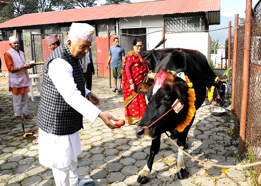 राष्ट्रपति पौडेलले शीतल निवासमा विधिपूर्वक गाईको पूजा गरी गाईलाई खानेकुरा खान दिएको राष्ट्रपतिको सचिवालयले जनाएको छ ।