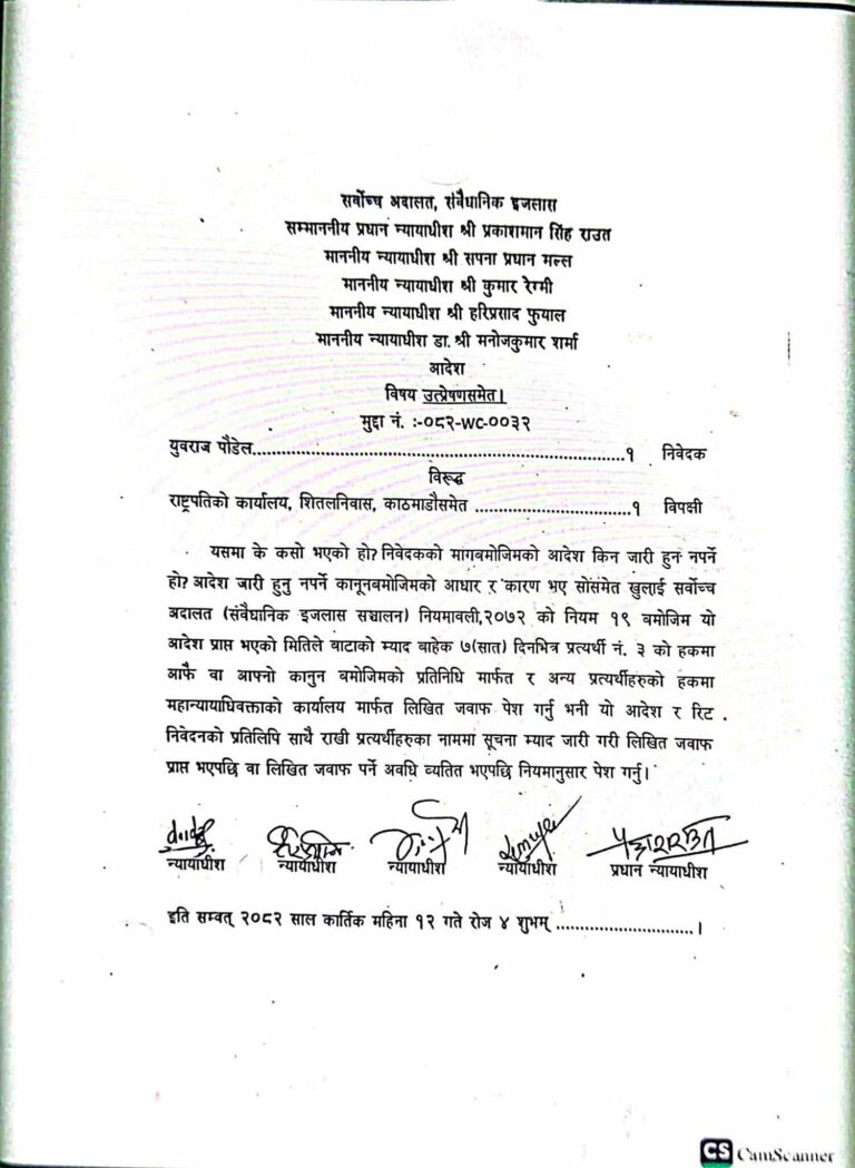 अदालतले विपक्षी पक्षहरूलाई सात दिनभित्र लिखित जवाफ पेस गर्न निर्देशन दिएको छ । तर, अन्तरिम आदेश भने जारी गर्न अस्वीकार गरिएको छ ।