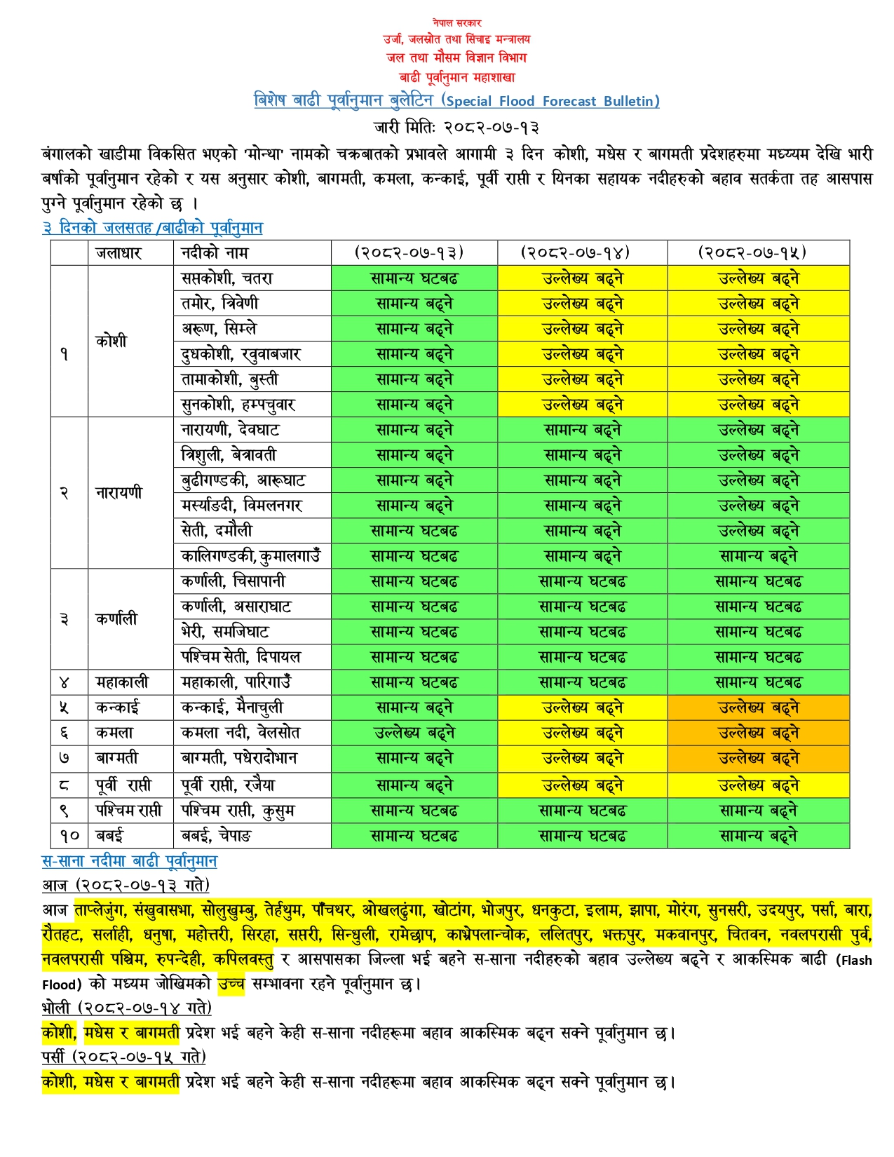 बिहीबार जारी विशेष बुलेटिनअनुसार ताप्लेजुङ, संखुवासभा, सोलुखुम्बु, तेह्रथुम, पाँचथर, ओखलढुंगा, खोटाङ, भोजपुर, धनकुटा, इलाम, झापा, मोरङ, सुनसरी, उदयपुर, पर्सा, बारा, रौतहट, सर्लाही, धनुषा, महोत्तरी, सिरहा, सप्तरी, सिन्धुली, रामेछाप, काभ्रेपलाञ्चोक, ललितपुर, भक्तपुर, मकवानपुर, चितवन, नवलपरासी (पूर्व-पश्चिम दुबै), रुपन्देही र कपिलवस्तुका साना नदीमा आकस्मिक बाढीको ‘मध्यम जोखिमसहित उच्च सम्भावना’ रहेको छ ।