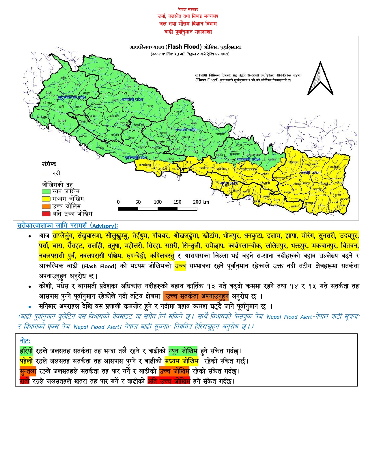 “कोसी, मधेस र वाग्मती प्रदेशका अधिकांश नदीहरूको बहाव कात्तिक १३ गते बढ्दो क्रममा रहने र १४ तथा १५ गते सतर्कता तह आसपास पुग्ने सम्भावना छ । त्यसैले नदीतटीय क्षेत्रका बासिन्दाले उच्च सतर्कता अपनाउनु आवश्यक छ ।”