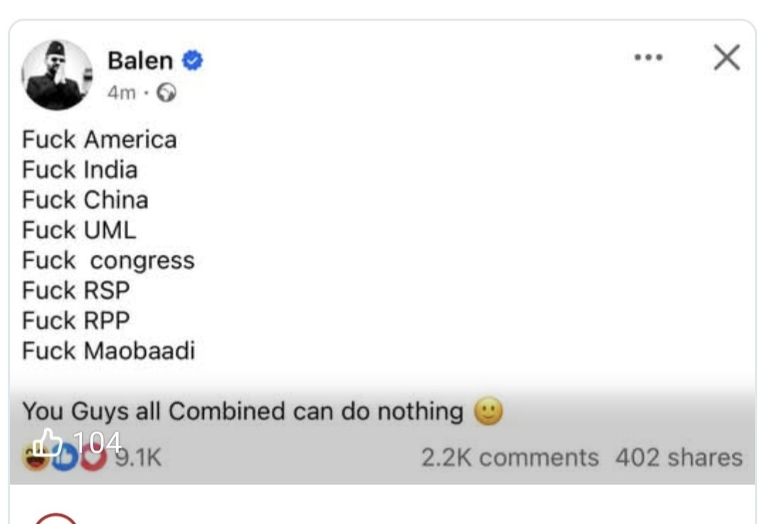 तर, बालेनले पोस्ट हटाए पनि त्यसको स्क्रिनशट सामाजिक सञ्जालभर ‘भाइरल’ बनेको छ । सो पोस्टमा उनले अश्लील शब्द प्रयोग गर्दै दुई छिमेकी देश-चीन र भारतसहित अमेरिका तथा नेपालका प्रमुख राजनीतिक दलहरूको नामसमेत उल्लेख गरेका थिए ।
