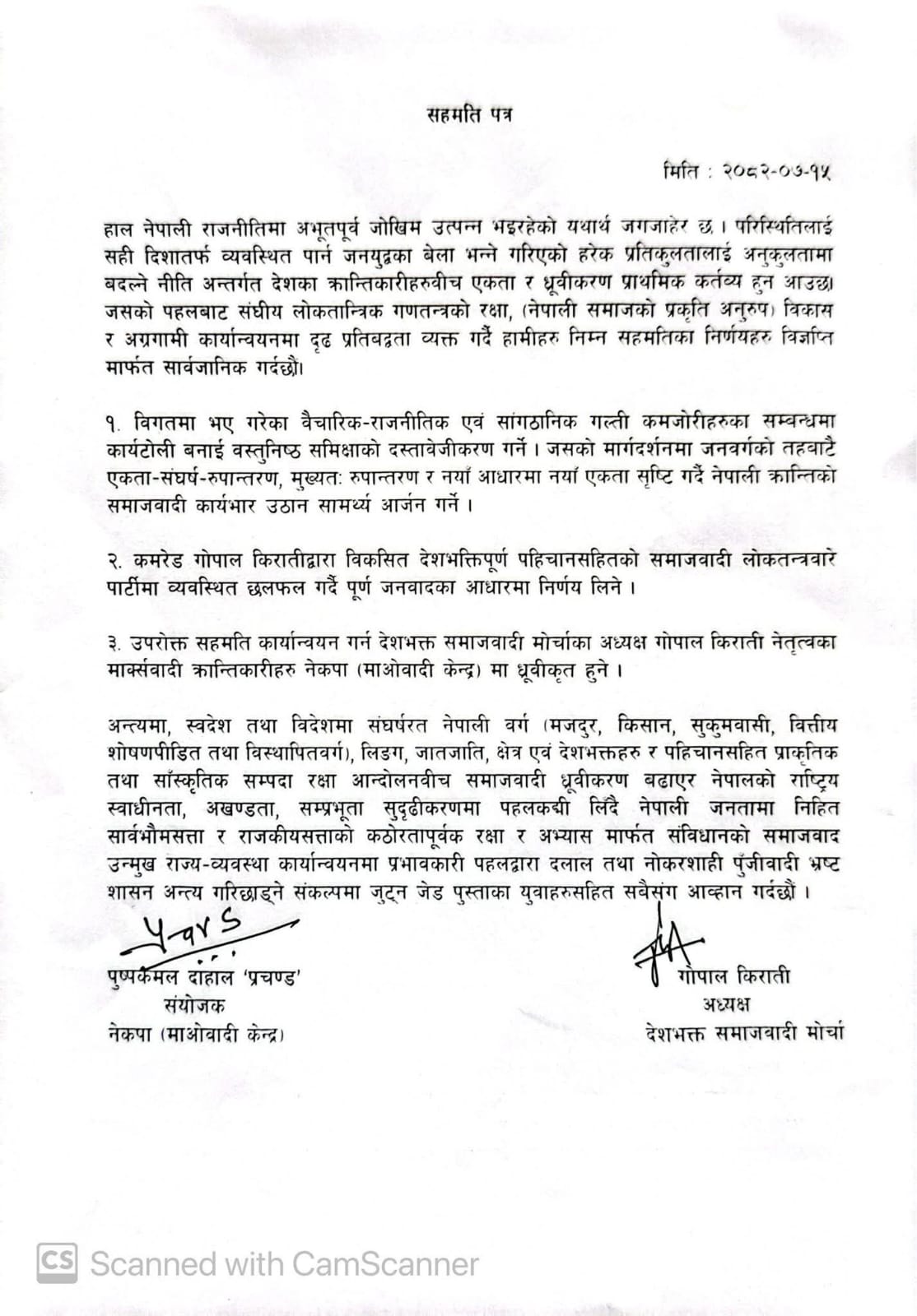 प्रचाण्ड र किराँतीले हस्ताक्षर गरेको सहमति पत्रमा हाल नेपाली राजनीतिमा उत्पन्न भइरहेको अभूतपूर्व जोखिम र चुनौतीपूर्ण अवस्थालाई सही दिशामा डोर्याउन यस निर्णयलाई आवश्यक ठहरिएको उल्लेख गरिएको छ।