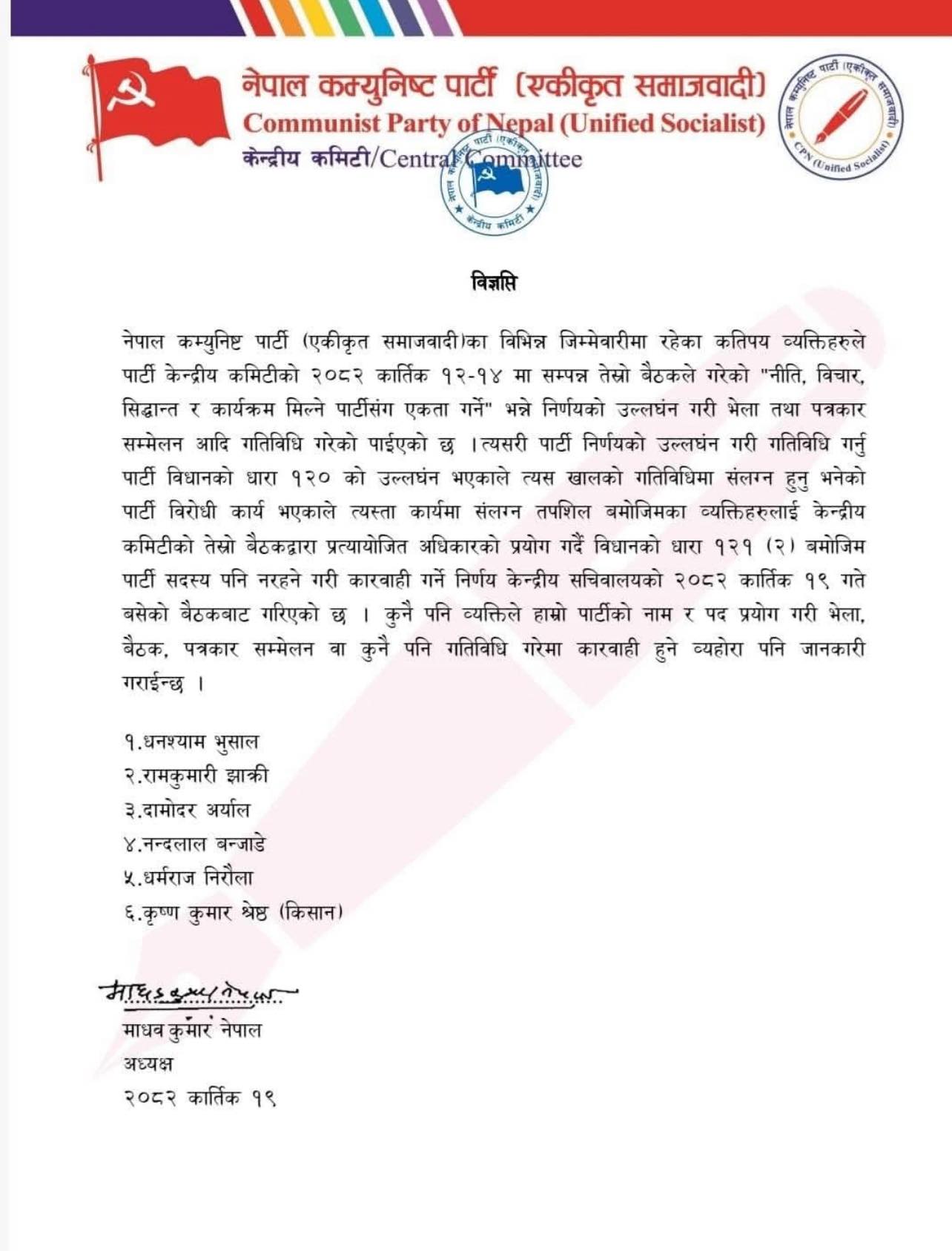 अध्यक्ष माधव कुमार नेपालले हस्ताक्षर गरेको एकीकृत समाजवादीका नेताहरु घनश्याम भूसाल, रामकुमारी झांक्री, किसान श्रेष्ठ, दामोदर अर्याल, नन्दलाल बन्जाडे र धर्मराज निरौलालाई पार्टीबाट कारबाही गरिएको विज्ञप्ति कार्तिक १९ गतेको मिति राखेर आज सार्वजनिक गरिएको छ ।