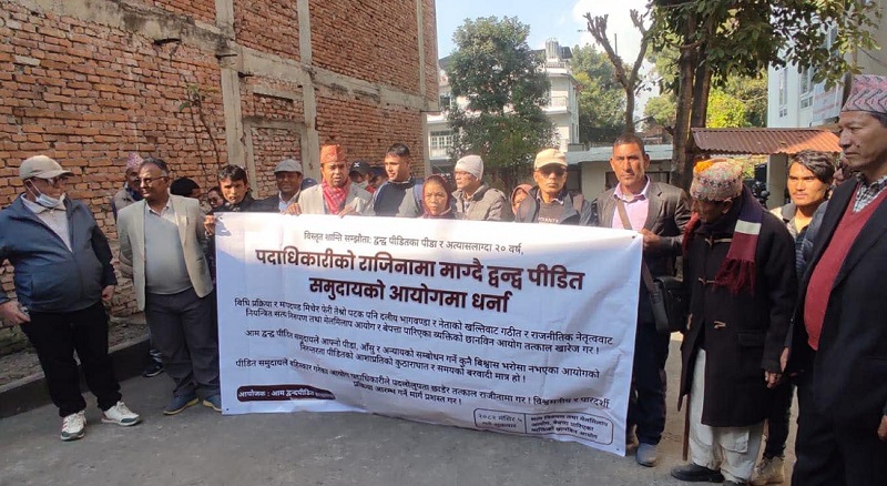 ‘आम द्वन्द्वपीडित समुदाय’को आह्वानमा भएको धर्नामा सहभागी पीडित राम भण्डारीले आयोगप्रति आफूहरुको विश्वास नभएको उल्लेख गर्दै दुवै आयोगका पदाधिकारीको राजीनामा माग गरे । आयोगमा वास्तविक पीडितको प्रतिनिधित्व हुने गरी आयोग पुनर्गठन गर्नुपर्ने उनका माग छ ।