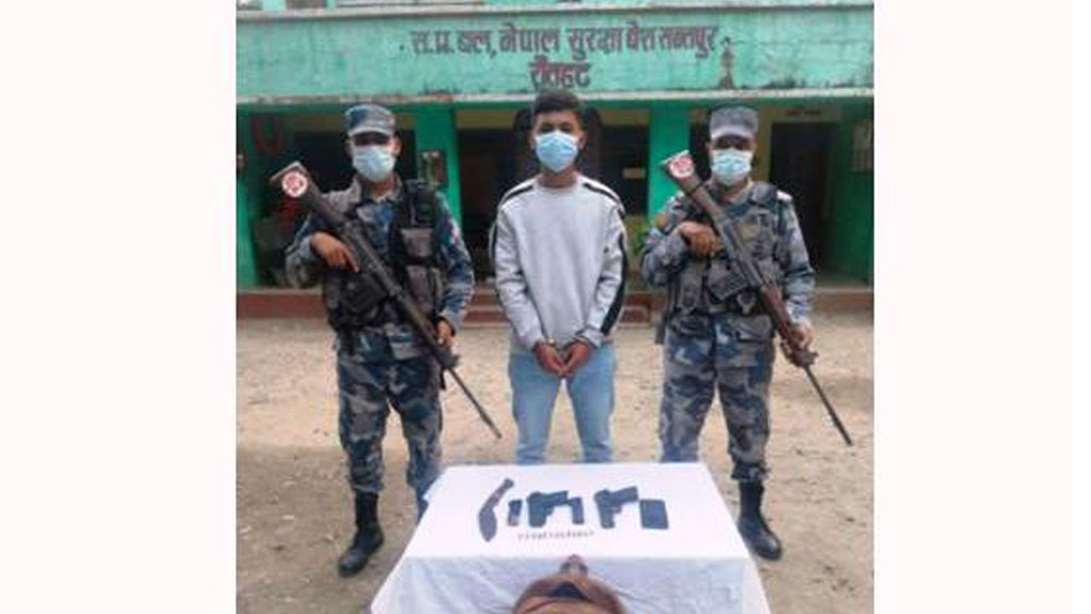 आज दिउँसो सशस्त्र प्रहरीको टोलीले मकवानपुरको हेटौडा उमहानगरपालिका–१३ पदमपोखरी बस्ने २२ वर्षीय सुमन आचार्यलाई पेस्तोलसहित पक्राउ गरेको हो ।