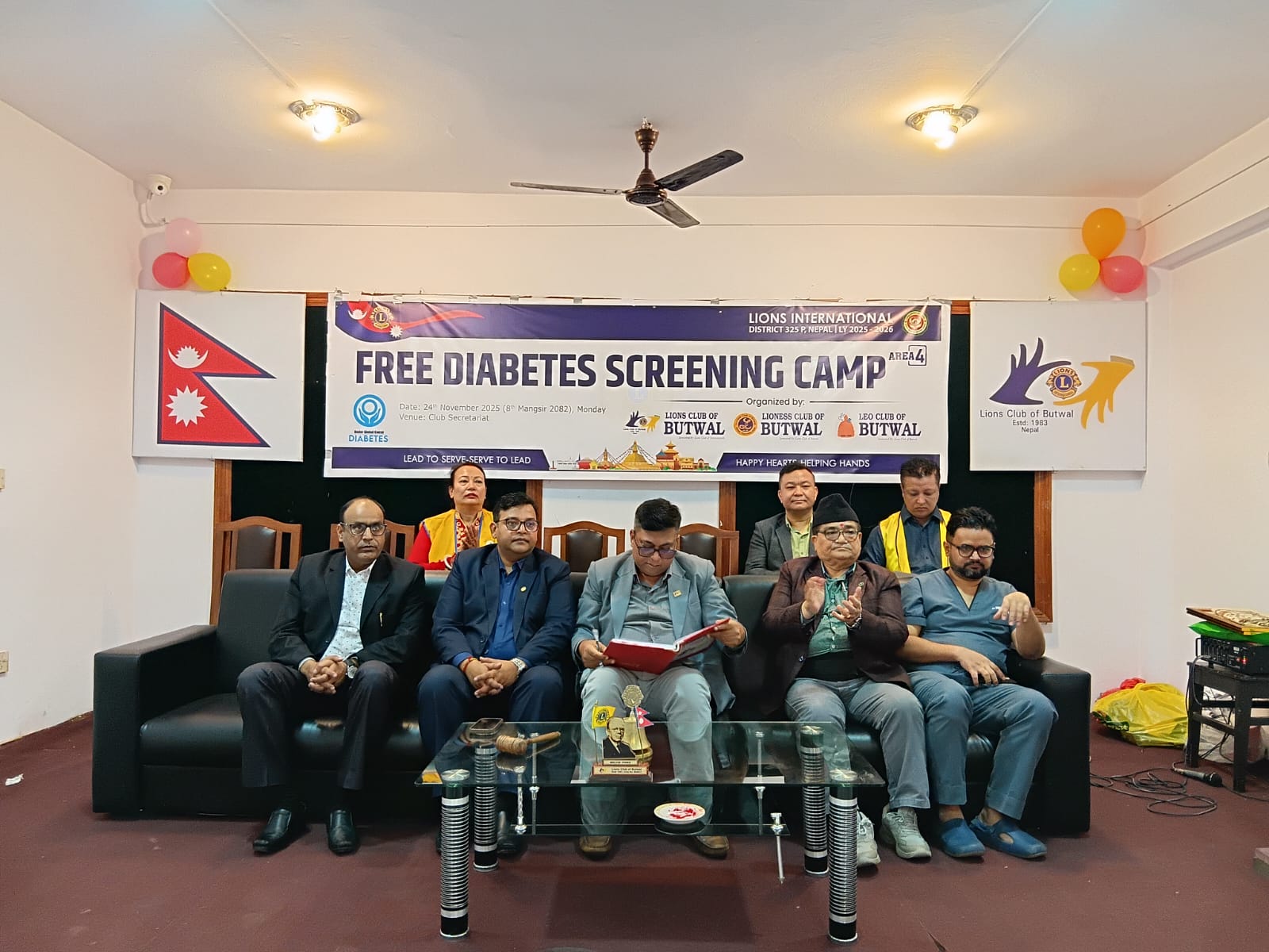 बुटवल । बुटवलमा निःशुल्क मधुमेह (डायबेटिस) स्क्रिनिङ शिविर सम्पन्न भएको छ । लायन्स क्लब अफ बुटवल लायनेन्स क्लब अफ बुटवल र लियो क्लब अफ बुटवलको संयुक्त आयोजनामा निःशुल्क मधुमेह (डायबेटिस) स्क्रिनिङ शिविर सम्पन्न भएको हो ।