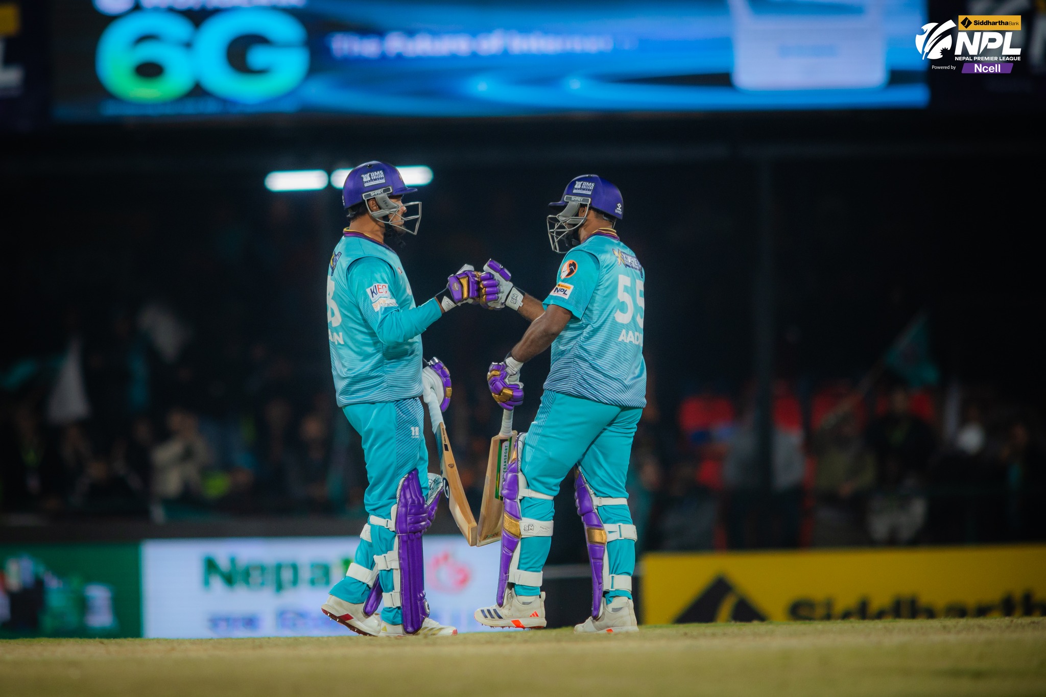 काठमाडौंका ओपनर आकाश त्रिपाठीले ३२ रन योगदान दिए । उनले ३६ बलमा चार छक्का प्रहार गर्दै इनिङ सम्हाले। त्यस्तै, सन्तोष यादवले १६ बलमा दुई छक्कासहित २६ रन जोडे ।