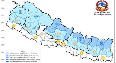 काठमाडौं । जल तथा मौसम पूर्वानुमान महाशाखाले हाल देशमा कुनै मौसम प्रणाली सक्रिय नरहेको जनाएको छ । आज दिउँसो र राति देशभर आंशिक बदली रहने छ ।