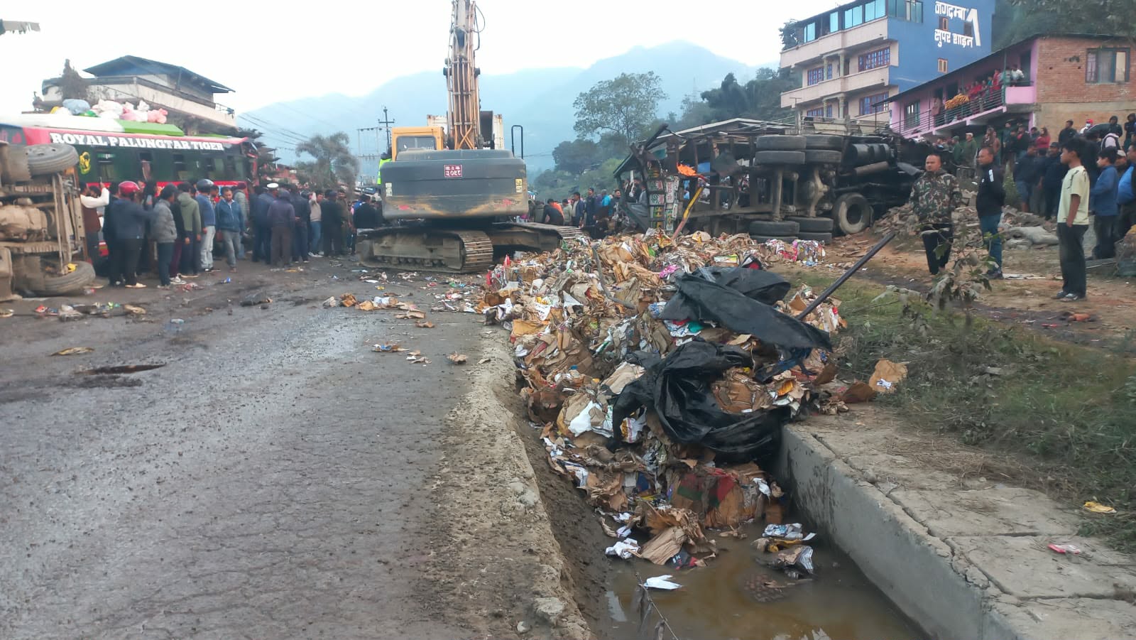 शनिबार दिउँसो काठमाडौंबाट गजुरीतर्फ जाँदै गरेको बा.प्र.००१ क ००११ नम्बरको स्कुल बस, एन.एल. ०१ बी.ए. ४६५४ नम्बरको डिब्बा गाडी, ना ४ ख ७१५ नम्बरको ट्रक, लु ९५ प ३०७ नम्बरको मोटरसाइकल, जी.जे. ०३ ए.के. ३२३१ नम्बरको बस र काठमाडौंतर्फ जाँदै गरेको ग १ ख ८५५१ नम्बरको बस तथा बा १ प ९१७ नम्बरको पर्यटक बस एकै स्थानमा दुर्घटनामा परेका थिए ।
