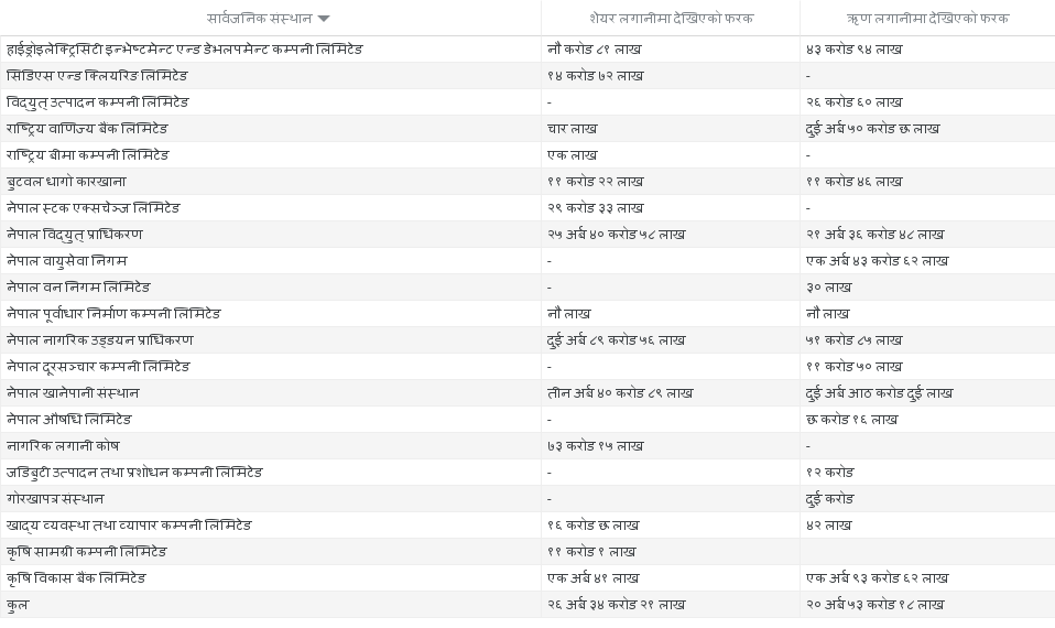 सार्वजनिक ऋण व्यवस्थापन कार्यालयका अनुसार विभिन्न संस्थानमा शेयरतर्फ रू २६ अर्ब ३४ करोड २१ लाख र ऋणतर्फ रू २० अर्ब ५३ करोड १८ लाख गरी कुल रू ४६ अर्ब ८७ करोड ३९ लाख सरकारी बराबर लगानीको हिसाब मिल्न सकेको छैन । सरकारले धेरै लगानी गरेको भन्छ, तर संस्थानहरुले कम भन्छन् । दशकौं अघिदेखिको हिसाबी गडबडीबारे जिम्मेवार को हो रु भन्ने प्रश्न पनि अनुत्तरित छ ।