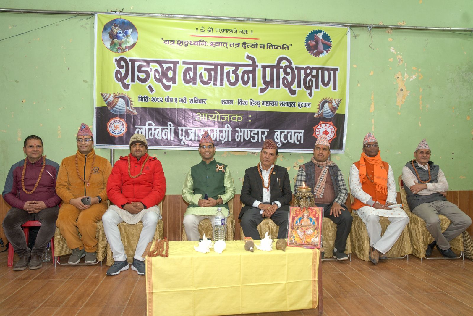 बुटवल । धर्म, संस्कार, कला र संस्कृतिको संरक्षण तथा प्रवर्द्धन गर्ने उद्देश्यका साथ नेपालमै पहिलोपटक सामूहिक रूपमा शङ्ख बजाउने प्रशिक्षण कार्यक्रम बुटवलमा सम्पन्न भएको छ । लुम्बिनी पूजासामग्री भण्डार, बुटवलको आयोजनामा विश्व हिन्दु महासङ्घ बुटवलको सभाहलमा उक्त प्रशिक्षण कार्यक्रम आयोजना गरिएको हो ।