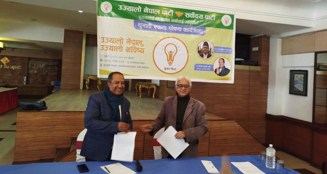 काठमाडौं । आगामी फागुन २१ गते हुने प्रतिनिधिसभा निर्वाचनलाई लक्षित गर्दै उज्यालो नेपाल पार्टी र सर्वोदय पार्टीबीच औपचारिक रूपमा चुनावी एकताको घोषणा गरिएको छ । आज यहाँ आयोजित संयुक्त पत्रकार सम्मेलनमार्फत दुवै पार्टीका शीर्ष नेतृत्वले चुनावी एकता घोषणापत्रमा हस्ताक्षर गर्दै संयुक्त रूपमा निर्वाचनमा सहभागी हुने प्रतिबद्धता जनाएका हुन ।