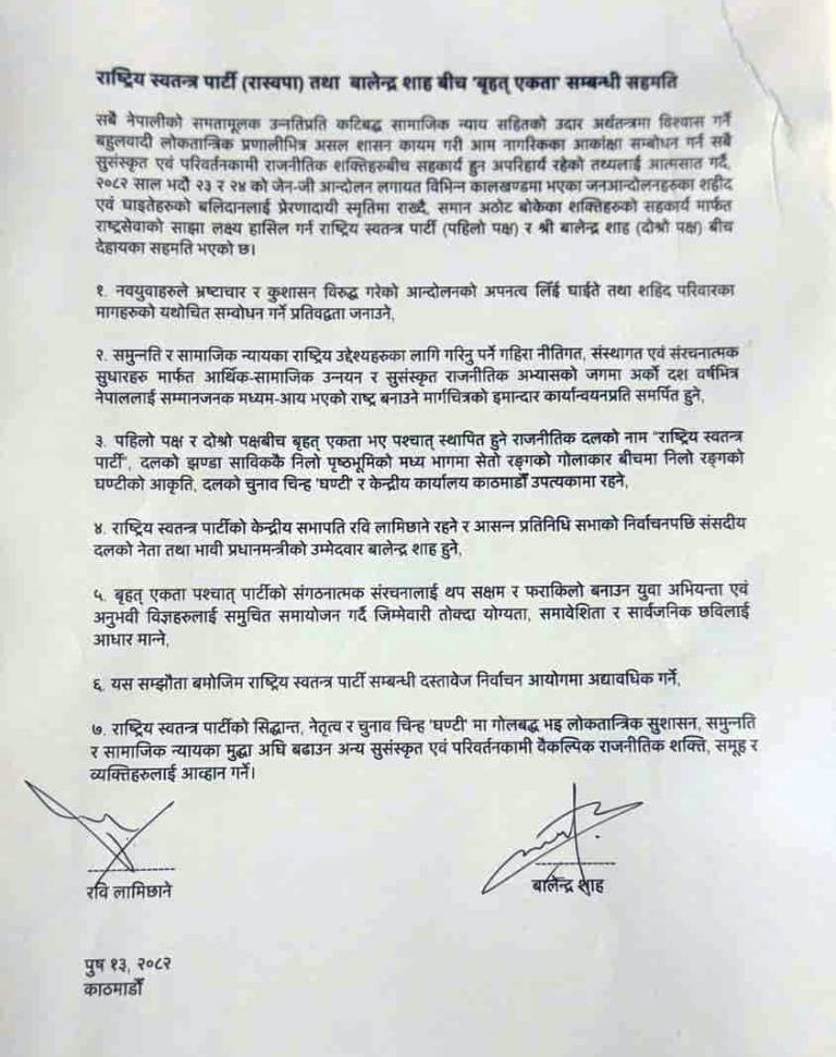 यसैगरी, सहमतिपछि सञ्चालन हुने राजनीतिक गतिविधि, पार्टीको नाम, चुनाव चिह्न तथा केन्द्रीय कार्यालय सबै ‘राष्ट्रिय स्वतन्त्र पार्टी’कै नाममा रहने उल्लेख गरिएको छ । नयाँ संरचनामा पनि रास्वपाकै पहिचान कायम रहने स्पष्ट गरिएको छ ।