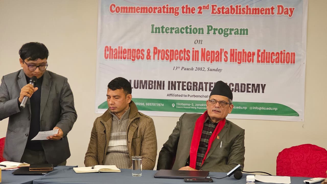 बुटवल । लुम्बिनी इन्टिग्रेटेड एकेडेमी, तिलोत्तमा-रूपन्देहीले आफ्नो दोस्रो वार्षिकोत्सव विविध कार्यक्रमका साथ आइतबार सम्पन्न गरेको छ । वार्षिकोत्सवको अवसरमा ‘नेपालको उच्च शिक्षामा चुनौती र सम्भावना’ विषयक अन्तरक्रिया कार्यक्रम आयोजना गरिएको थियो, जसमा शिक्षा क्षेत्रका विज्ञ, शिक्षाविद्, प्रशासक तथा सरोकारवालाहरूले गहन छलफल गरेका थिए ।