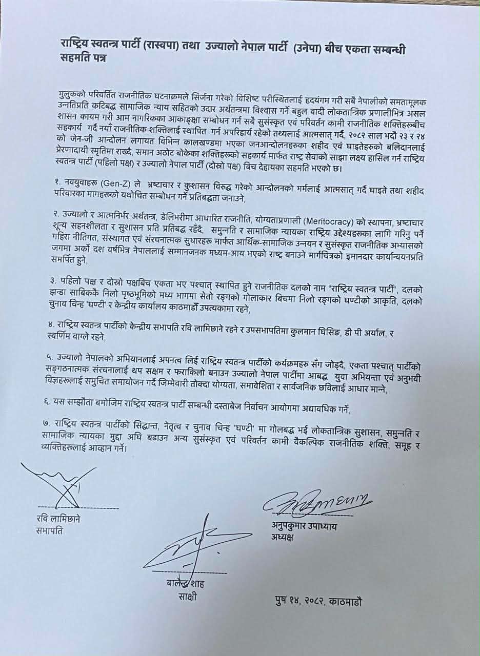 रास्वपा सभापति लामिछाने र उज्यालो नेपाल पार्टीका अध्यक्ष अनुपकुमार उपाध्यायले हस्ताक्षर गरेको समझदारी पत्रमा मा बालेनले साक्षीका रूपमा हस्ताक्षर गरेका छन् ।