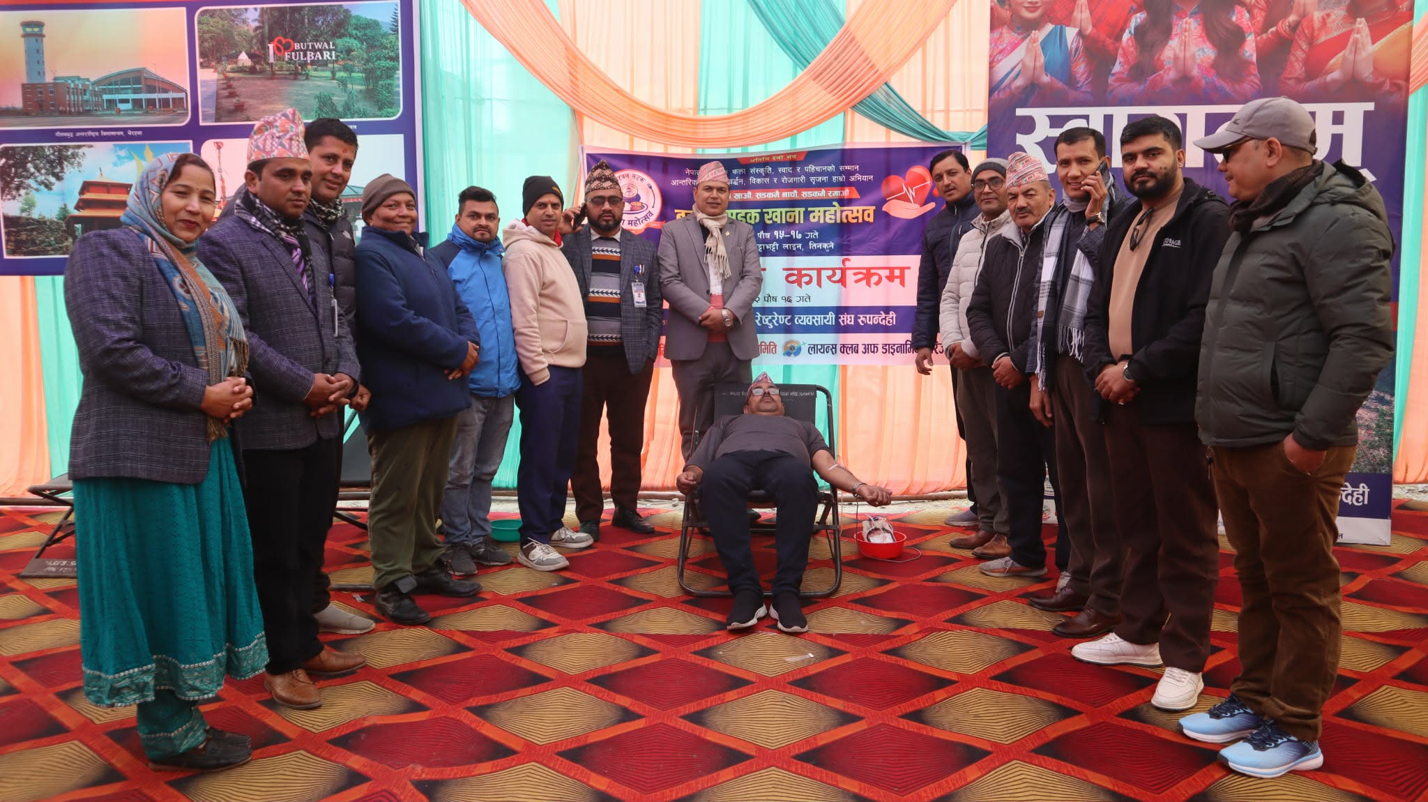 बुटवल । पर्यटन प्रवद्र्धनसँगै सामाजिक उत्तरदायित्वलाई प्राथमिकतामा राख्दै बुटवलमा जारी बुटवल सडक खाना महोत्सवअन्तर्गत बुधबार रक्तदान कार्यक्रम सम्पन्न भएको छ । रुपन्देही होटल तथा रेष्टुरेन्ट व्यवसायी संघको आयोजनामा, नेपाल नियमित रक्तदाता संघ तथा लायन्स क्लब अफ बुटवल डाइनामिक टुरिजमको सहकार्यमा महोत्सव स्थलमै रक्तदान कार्यक्रम आयोजना गरिएको हो ।