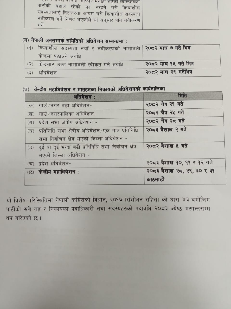 त्यसैगरी, प्रतिनिधिसभा निर्वाचन क्षेत्र अधिवेशन अन्तर्गत एक मात्र प्रतिनिधिसभा निर्वाचन क्षेत्र रहेको जिल्लामा २०८३ वैशाख २ गते अधिवेशन गरिनेछ । दुई वा सोभन्दा बढी प्रतिनिधिसभा निर्वाचन क्षेत्र भएका जिल्लामा भने २०८३ वैशाख ५ गते जिल्ला अधिवेशन गर्ने प्रस्ताव गरिएको छ ।