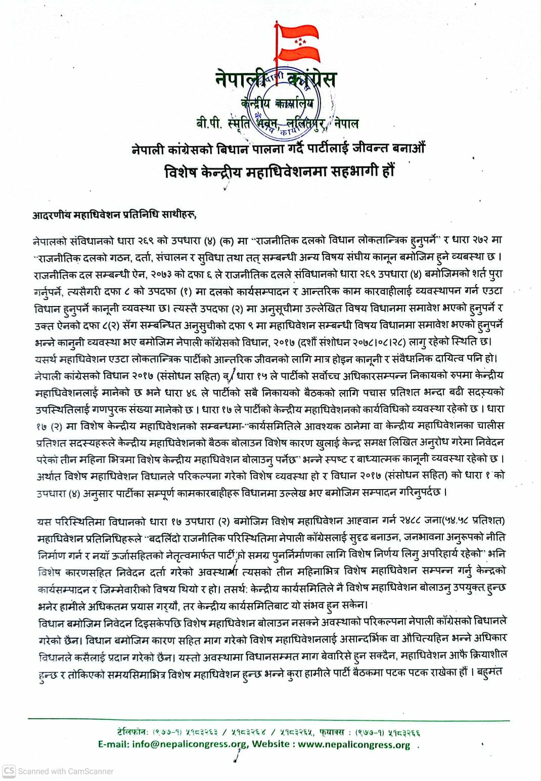 महामन्त्रीद्वयले भनेका छन्, “विधानअनुसार कारणसहित दिइएको निवेदनपछि विशेष महाधिवेशन नबोलाउन नसक्ने अवस्था कांग्रेसको विधानमा कल्पना गरिएको छैन। सो मागलाई असान्दर्भिक वा औचित्यहीन ठहर गर्ने अधिकार पनि कसैलाई प्राप्त छैन।”