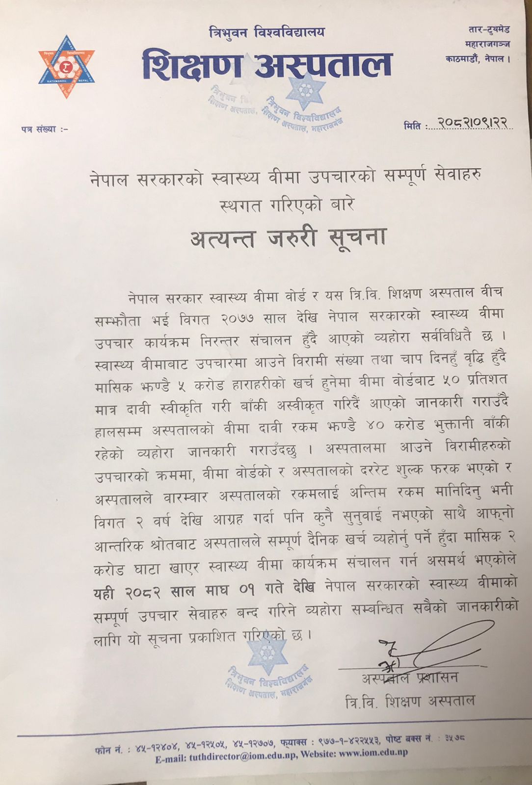 काठमाडौं । विगत लामो समयदेखि बीमा बोर्डले दाबी भुक्तानी नगरेपछि त्रिभुवन विश्वविद्यालय शिक्षण अस्पताल (टिचिङ अस्पताल) ले स्वास्थ्य बीमाको सेवा नै बन्द गर्ने निर्णय गरेको छ । टिचिङ अस्पताल अस्पताल प्रशासनले आगामी माघ १ गतेदेखि स्वास्थ्य बीमा अन्तर्गतका सम्पूर्ण उपचार सेवा बन्द गर्ने निर्णय गरेको हो ।