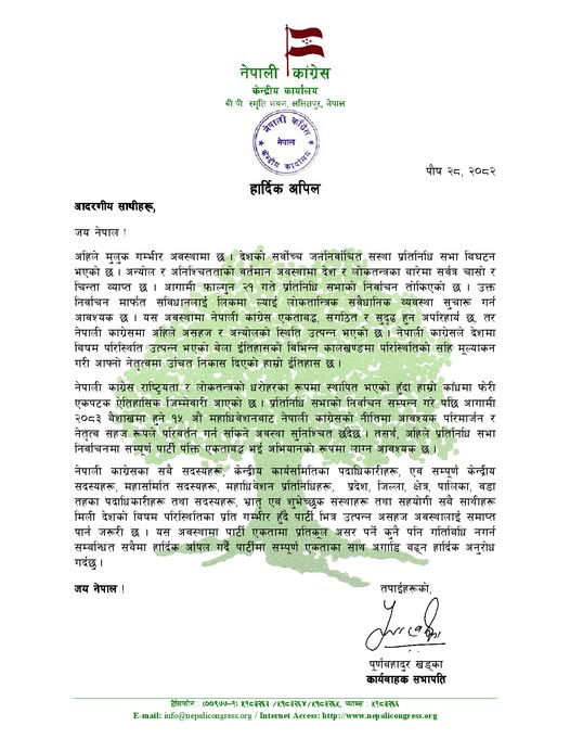 खड्काले भनेका छन्, ‘नेपाली कांग्रेसका सबै सदस्यहरू, केन्द्रीय कार्यसमितिका पदाधिकारीहरू, एवं सम्पूर्ण केन्द्रीय सदस्यहरू, महासमिति सदस्यहरू, महाधिवेशन प्रतिनिधिहरू, प्रदेश, जिल्ला, क्षेत्र, पालिका, वडा तहका पदाधिकारीहरू तथा सदस्यहरू, भ्रातृ एवं शुभेच्छुक संस्थाहरू तथा सहयोगी सबै साथीहरू मिली देशको बिषम परिस्थितिका प्रति गम्भीर हुँदै पार्टी भित्र उत्पन्न असहज अवस्थालाई समाप्त पार्न जरूरी छ,’ उनले भनेका छन्,’यस अवस्थामा पार्टी एकतामा प्रतिकूल असर पर्ने कुनै पनि गतिबिधि नगर्न सम्बन्धित सबैमा हार्दिक अपिल गर्दै पार्टीमा सम्पूर्ण एकताका साथ अगाडि बढ्न हार्दिक अनुरोध गर्दछु ।’